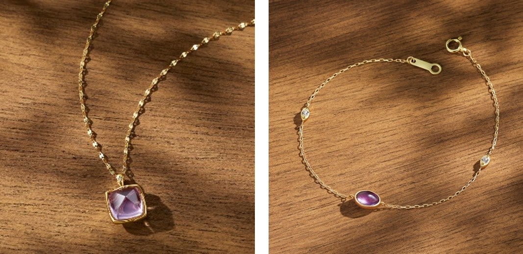 「砂糖のひとかたまり」という意味を持つシュガーローフカットのアメシストが、モダンかつキュートな丸みで輝くネックレスも。大振りのアメシストの裏には、リーフモチーフの透かしを施したさりげない遊び心が光ります。丸みを帯びたカボションショットのブレスレットは、秋らしいモダンで優しい雰囲気が印象的。ブレスレットの裏にもリーフモチーフがのぞきます。