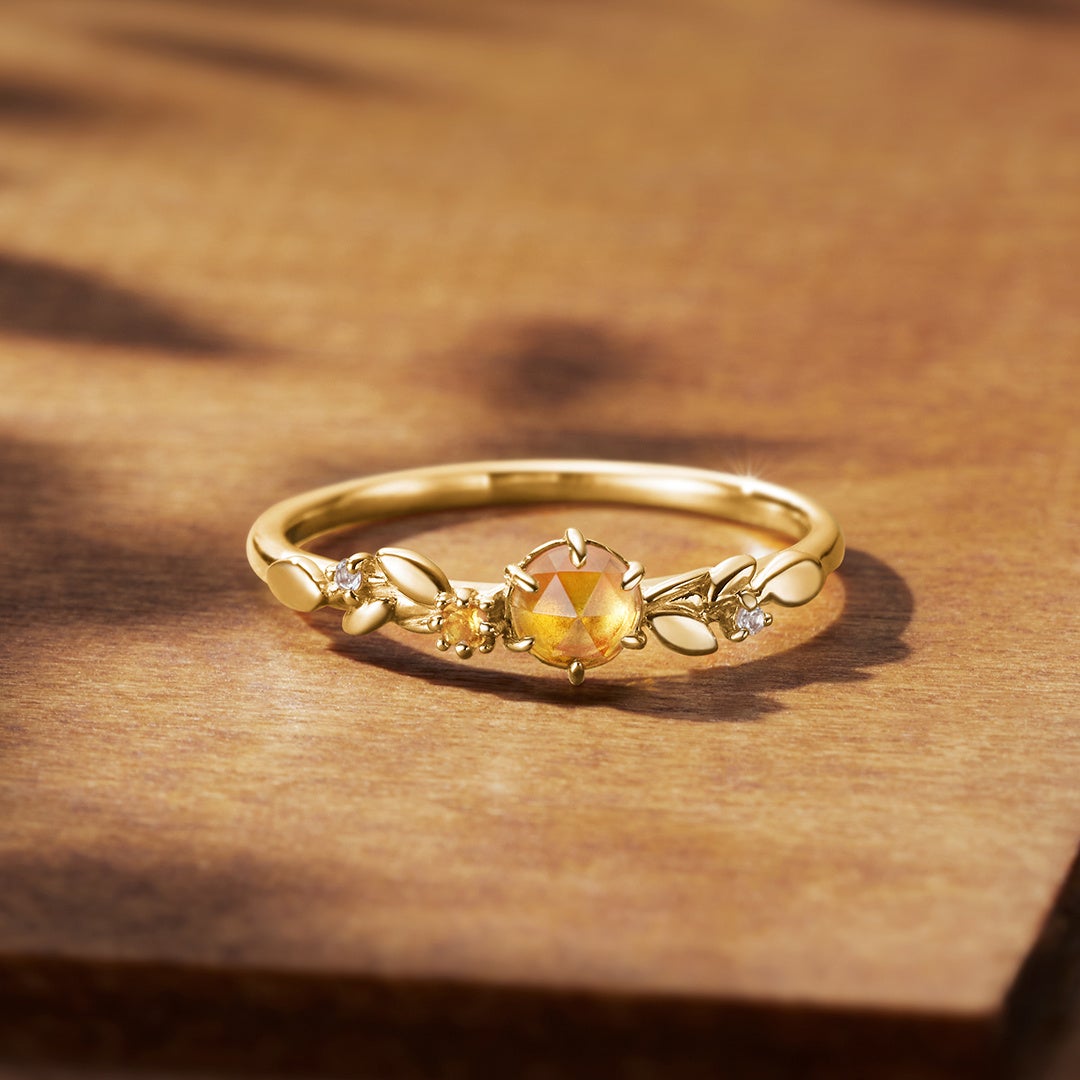 秋の風をうけて葉が舞い上がり踊る情景を現したイヤーカフネックレスやリングが登場。リズミカルに連なったリーフモチーフの地金をベースに、秋に咲くオレンジ色のバラをイメージしたローズカットのシトリンがきらめくシリーズです。イヤーカフネックレスはチェーンを外してそれぞれイヤーカフとしてもチェーン単体でも使えるので、1本でコーディネートの幅が広がります。リングも、重なったリーフのモチーフが光を受けて輝きを放つ存在感のあるデザインに。2本のリングの組み合わせによって、様々なコーディネートがお楽しみいただけます。