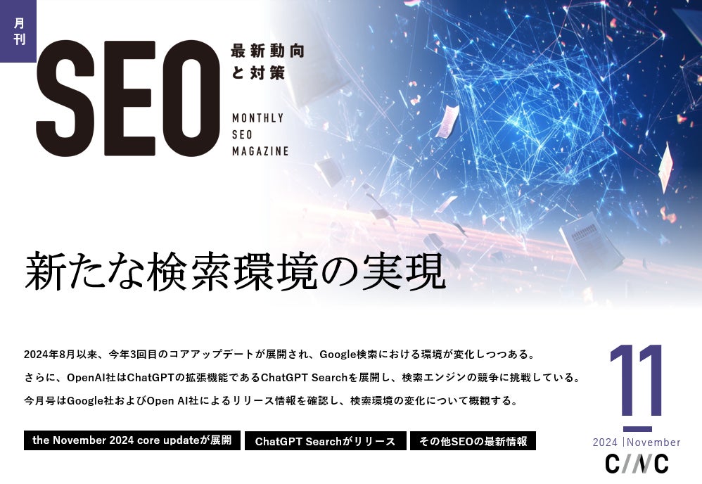 株式会社CINC(本社:東京都港区、代表取締役社長:石松友典、以下CINC)は、毎月特定のテーマのSEO最新動向と対策についてレポートする「月刊SEO」の11月号を公開しました。