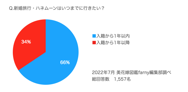 新婚旅行・ハネムーンの時期について入籍から1年以内に行きたいと答えた方が多い結果に。新婚旅行・ハネムーンということであまり先延ばしにしたくないと考える花嫁様や、慶事休暇が取れるタイミングの兼ね合いで早めに新婚旅行・ハネムーンを予定しているという花嫁様も多く見受けられました。