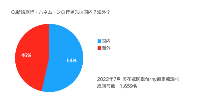 続いては、新婚旅行・ハネムーンの行き先について。コロナ禍で新婚旅行・ハネムーンの行き先を悩んでいる花嫁様も多い中、国内と答えた花嫁様が全体の54%で889名と半数以上を占める結果に。コロナ禍ということもあり国内旅行の需要が増えているようです。また、全体の46%の770名の花嫁様は海外旅行の回答。新婚旅行・ハネムーンでは、普段はなかなか行けない憧れの海外旅行へ行きたいと思う花嫁様も多く、コロナが落ち着いているタイミングを見計らって、旅行先の情勢などもみながら、海外旅行の計画を立てられる花嫁様も多いようです。