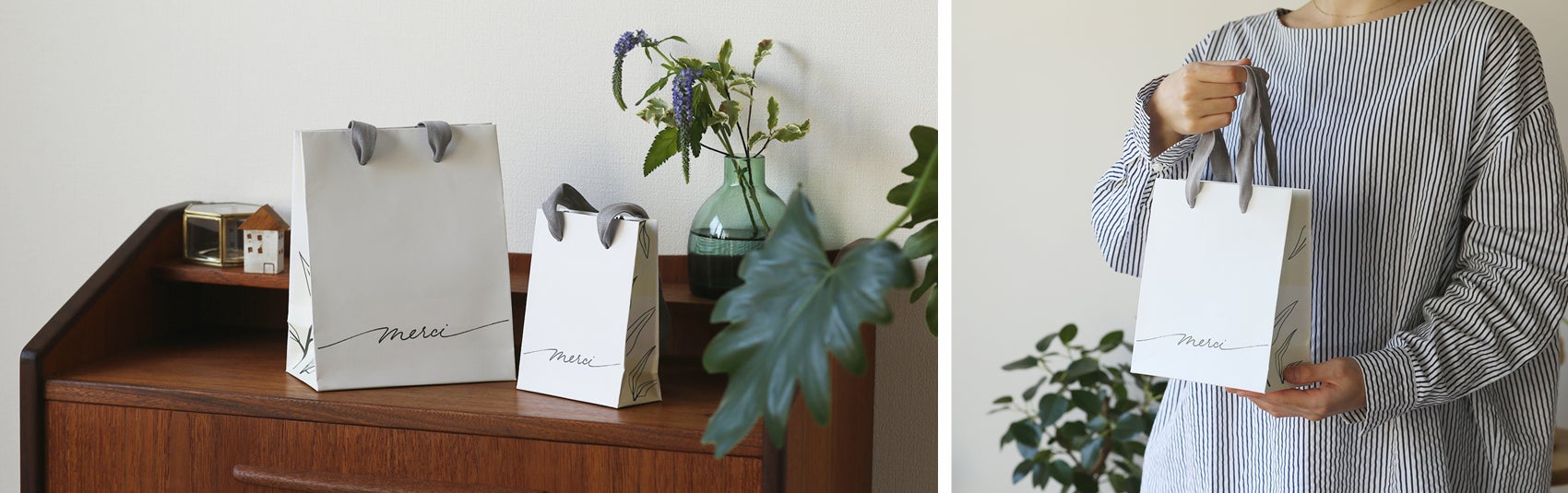 バッグの本体は古紙40%を使用し、持ち手部分は紙製平撚り紐、印刷には植物性インキを使用しています。ジェンダーレスな植物モチーフのデザインで、本体には「Merci」と感謝の気持ちを添えられるようなデザインにしました。