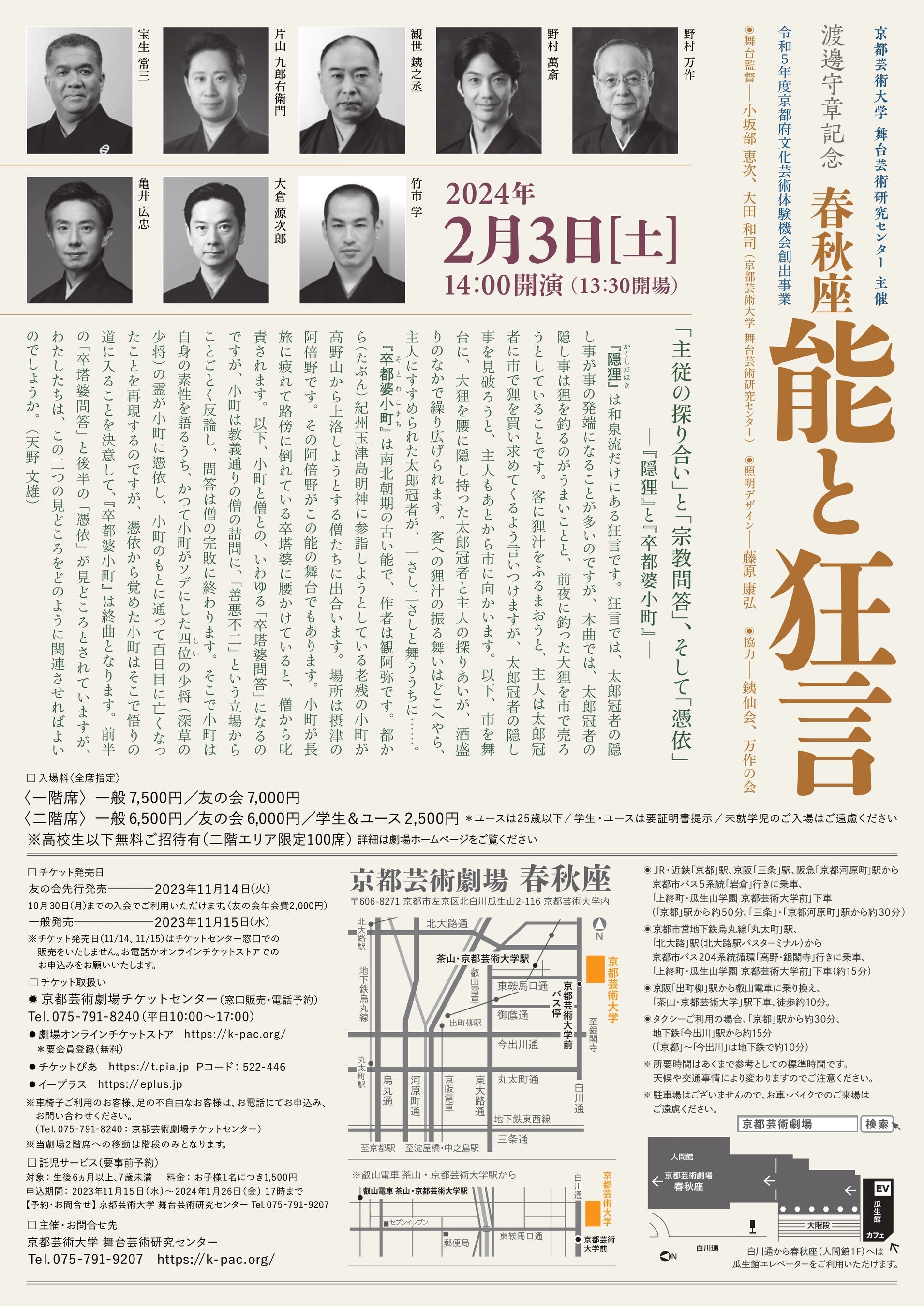 京都芸術劇場春秋座で2024年2月3日(土)に「渡邊守章記念 春秋座―能と狂言」を上演します!