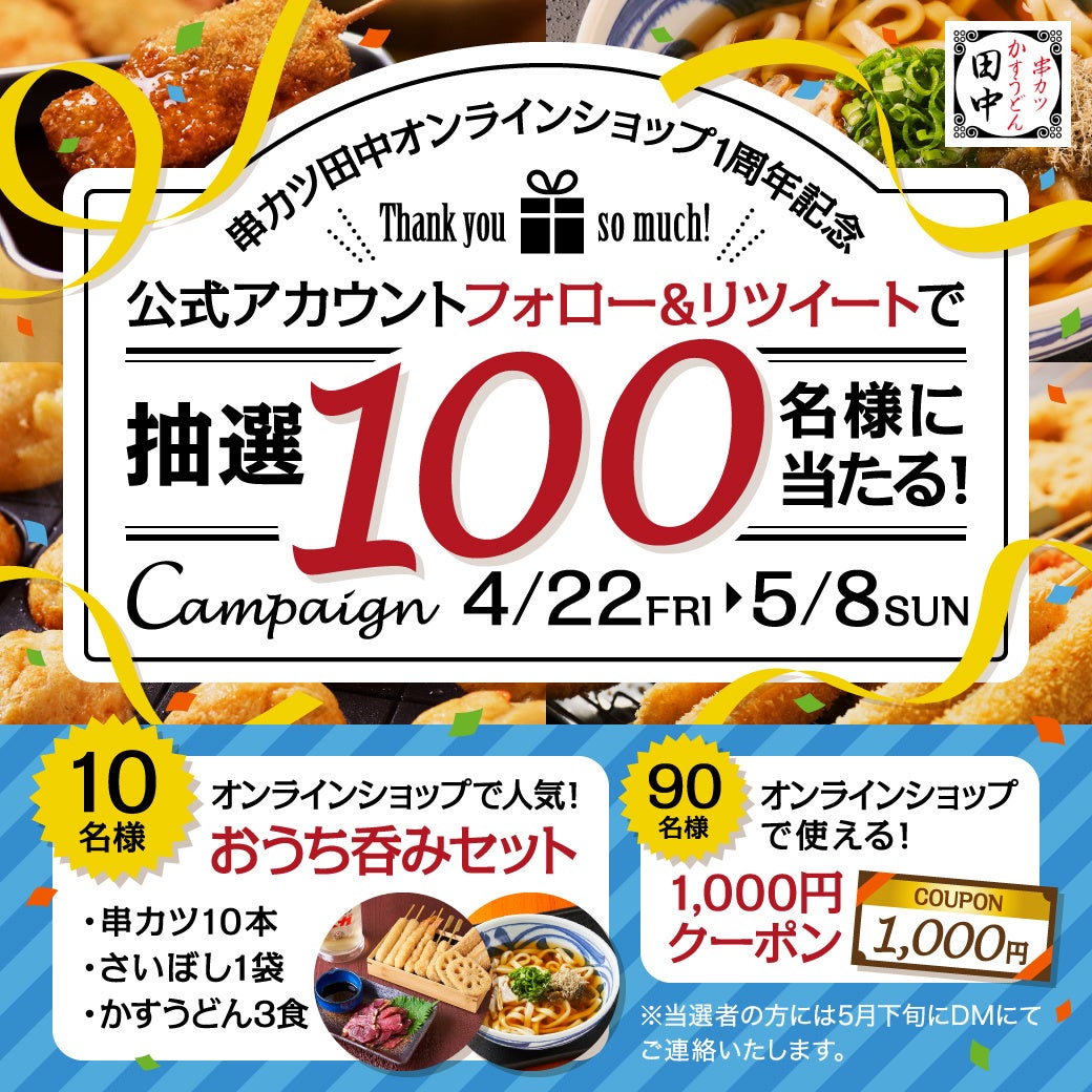 コロナ禍にオープンし、厳しいなかでも支えてくださった皆さまの応援のおかげで1周年を迎えることができました。皆さまへの感謝の気持ちと、ご自宅でも串カツ田中の味をこれからも美味しく、楽しく召し上がっていただきたいという想いで1周年記念キャンペーンを3種類ご用意いたします。