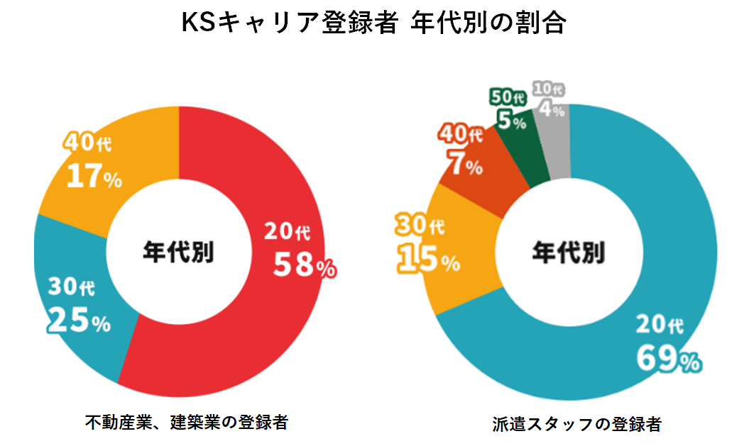 また、KSキャリアではさまざまな年代の方に登録いただいています。不動産、建築業界への経験が不問である求人が多いことが要因の一つで、人材紹介の登録者及び派遣登録者のそれぞれを見ても20代の方が多いことが特徴です。