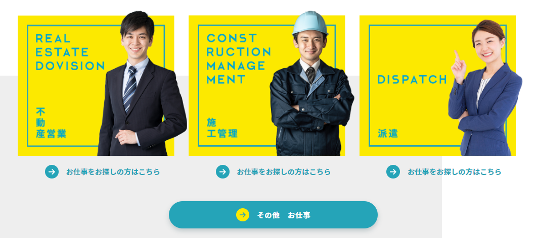 当社グループ会社の強みを生かして、不動産業、建築業への転職支援を得意としています。不動産仲介・ハウスメーカー・工務店・マンション販売・投資用不動産の営業・施工管理・設計・一般事務・不動産管理・総務・人事・経理・Webマーケティングまで様々な職種のご提案が可能です。