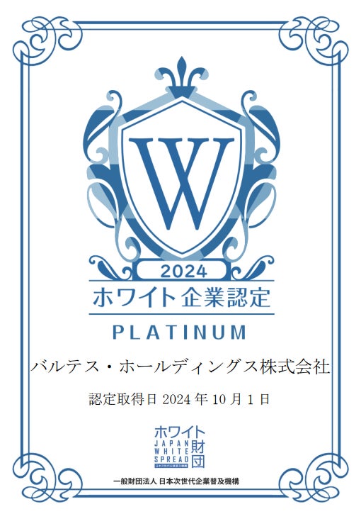 ソフトウェアのテスト・品質向上におけるトータルサポートを提供するバルテス・ホールディングス株式会社(本社:大阪市西区、東京都千代田区、代表取締役会長 兼 社長:田中 真史、以下「当社」)は、一般財団法人日本次世代企業普及機構(以下ホワイト財団)が展開する2024年度のホワイト企業認定制度において、昨年に引き続き最高ランクとなるプラチナランクを獲得したことをお知らせいたします。