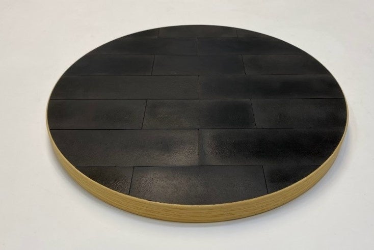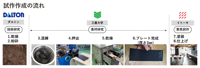 野中教授による独自の押出成形技術*)を用いて、コーヒー豆のかすの微粉末から厚さ3mmのプレートを製作 - 【イトーキ:家具試作】(上記図⑦⑧)