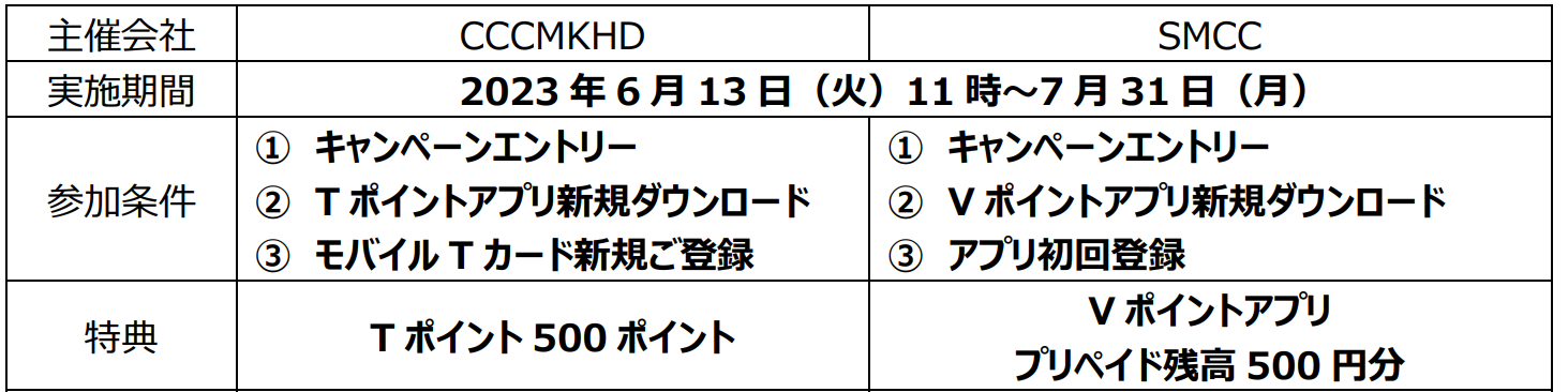 2023年6月13日より、CCCMKHDおよびSMCCにてそれぞれ「Vポイント発表記念キャンペーン」を開始します。