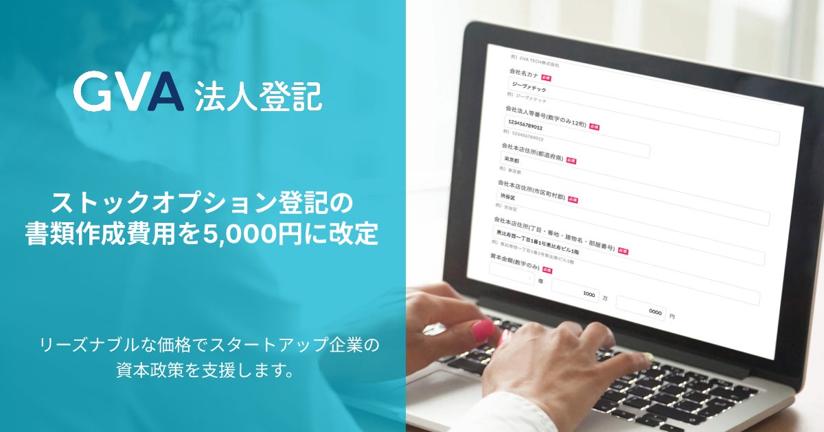 リーガルテックサービスの開発・運営を行うGVA TECH株式会社(本社:東京都渋谷区、代表取締役:山本 俊)のオンライン商業登記支援サービス「GVA 法人登記」にて、ストックオプション発行の登記書類作成費用を5,000円に改定したことをお知らせいたします。
