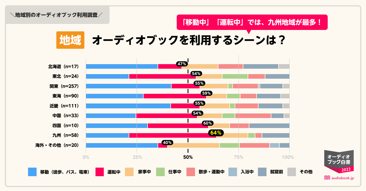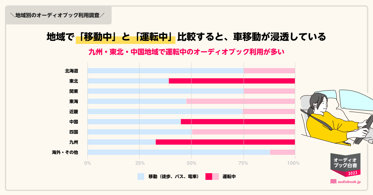 九州地域は運転中のオーディオブック利用が最多!車移動が浸透している地域では音楽やラジオ感覚で耳読書<オーディオブック白書2023>