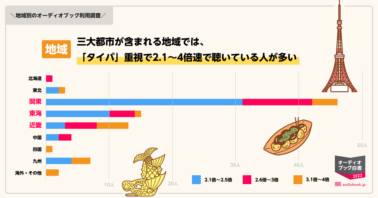 地域別(図8)で2.1倍速~4倍速を見てみると、関東を筆頭に、東海、近畿とビジネスパーソンが集中する三大都市圏が含まれる地域において高倍速でオーディオブックを聴いている傾向がでました。「タイパ」を重視、実践しているユーザーが多いことがわかります。