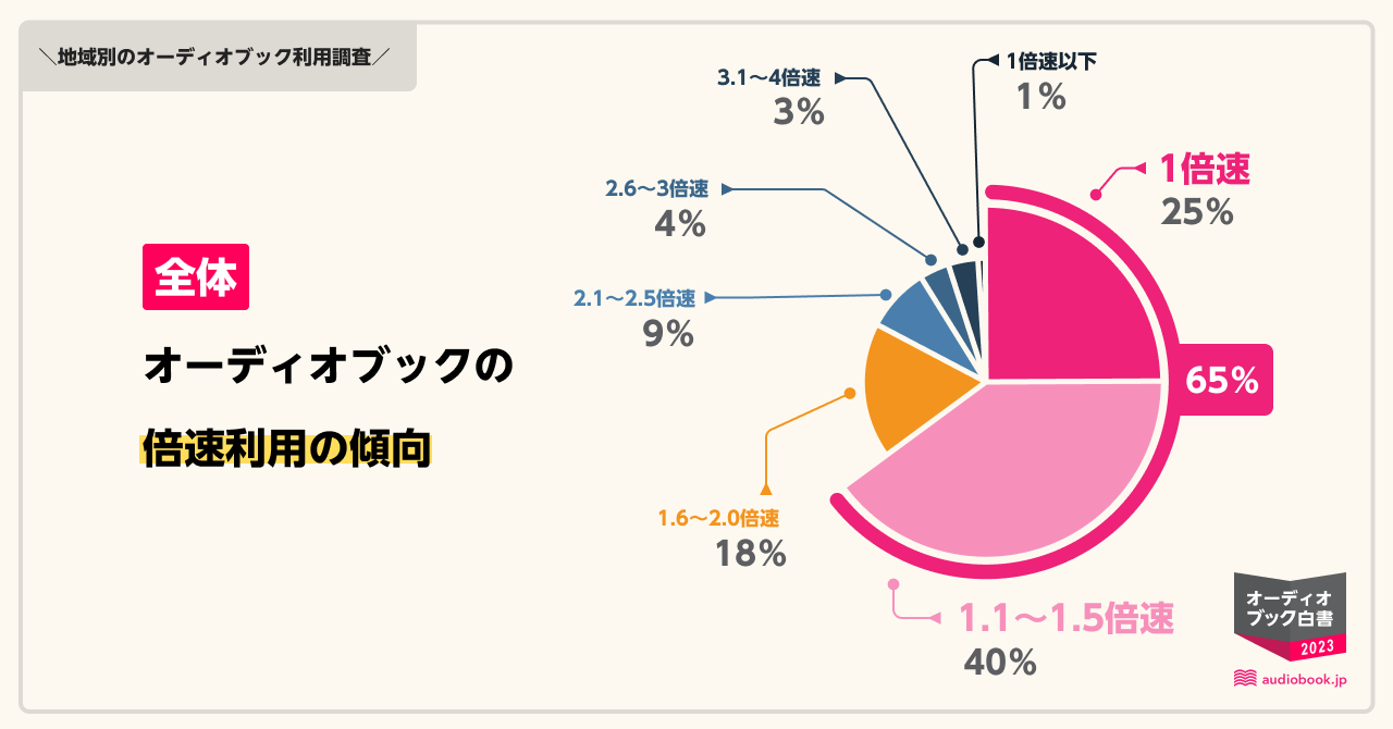 ユーザーの倍速利用傾向を調査し、全体(図7)で見るとユーザーの約65%が1.0倍速~1.5倍速で聴いていることがわかりました。