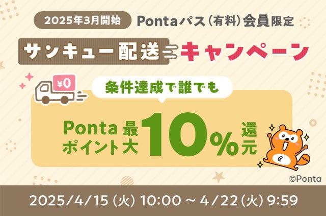 auコマース&ライフは、2025年4月15日から4月22日までの期間、総合ショッピングサイト「au PAY マーケット」において、Pontaパス会員限定で対象商品を3,980円以上お買い上げいただくと、最大10%のポイントを還元する「サンキュー配送キャンペーン(以下、本キャンペーン)」を開催します。