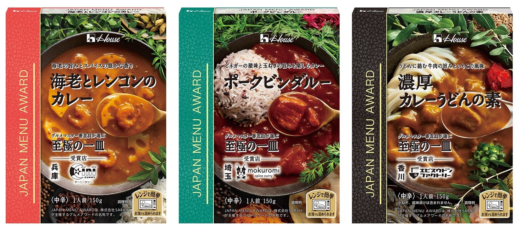 グルメコミュニティサービス「SARAH」(サラ)が主催する日本全国の「至極の一皿」を表彰するグルメアワード”JAPAN MENU AWARD”受賞メニューの味わいをレトルトカレーで再現することで、ご家庭へ名店の美味しさをお届けします。内容量150g、オープン価格(税別参考小売価格329円)。