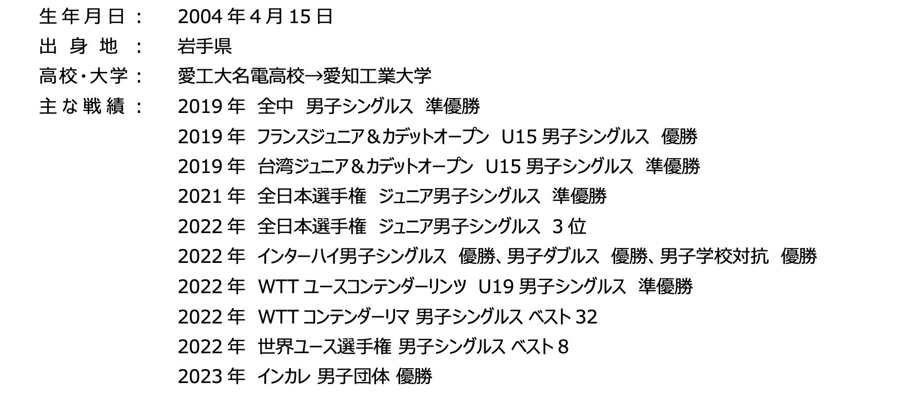 7thシーズンから琉球アスティーダに入団して成長著しい鈴木選手と、今シーズンも一緒に戦えることを心より嬉しく思います。鈴木選手はパワフルなプレーでチームに貢献してくれて間違いなく次世代の卓球界を牽引していく逸材です。今シーズンもその若さと勢いで琉球アスティーダの王座奪還に向けて活躍してくれることを期待しています。