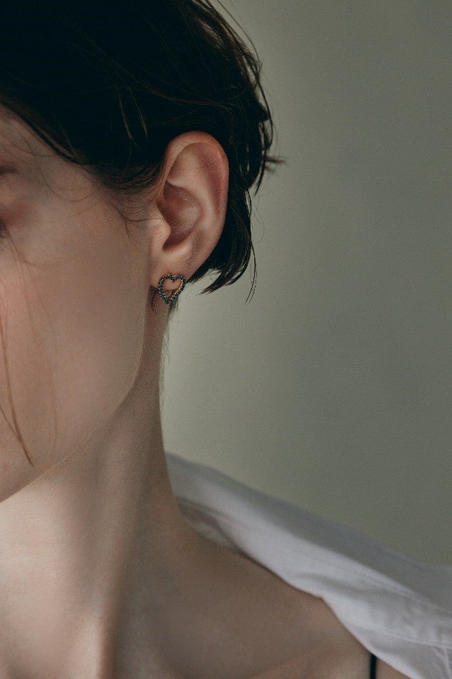 スタイリッシュなタトゥーを表現するため、グレージュカラーのキュービックジルコニアを使用。石留部分のみに漆黒のカラーリングを施すことで、濡れているように輝くタトゥーを表現しました。縦長のオープンハートモチーフから耳たぶが少し覗き、可愛らしさと抜け感が共存するデザインに仕上げました。