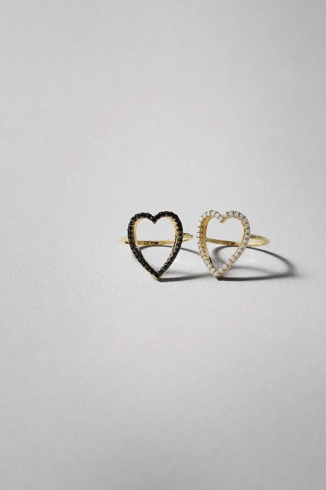 漆黒のオープンハートで描くファインラインタトゥーを表現したリング。指に沿う滑らかな曲線、かつ手の甲に伸びるスキニーなハートモチーフで、着用した際に指を長く美しく見せる効果も期待できます。