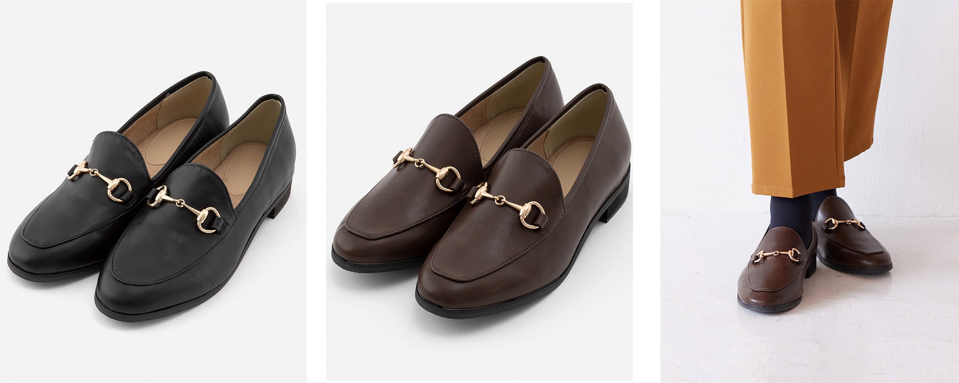 シーズンレスに使えるシンプルなビットローファー。どんなコーディネートにも合わせやすく、1足は持っておきたい万能アイテムです。少し厚みをもたせたソールは履き心地が良くほどよいボリューム感、金具アクセサリーで足元に上品さをプラスします。見た目の美しさと履き心地を両立させるために、何度も試作を繰り返して完成しました。秋冬の落ち着いたコーディネートに合わせやすいダークブラウンが新色に加わり、コーディネートを引き締めるブラックの2色で展開です。