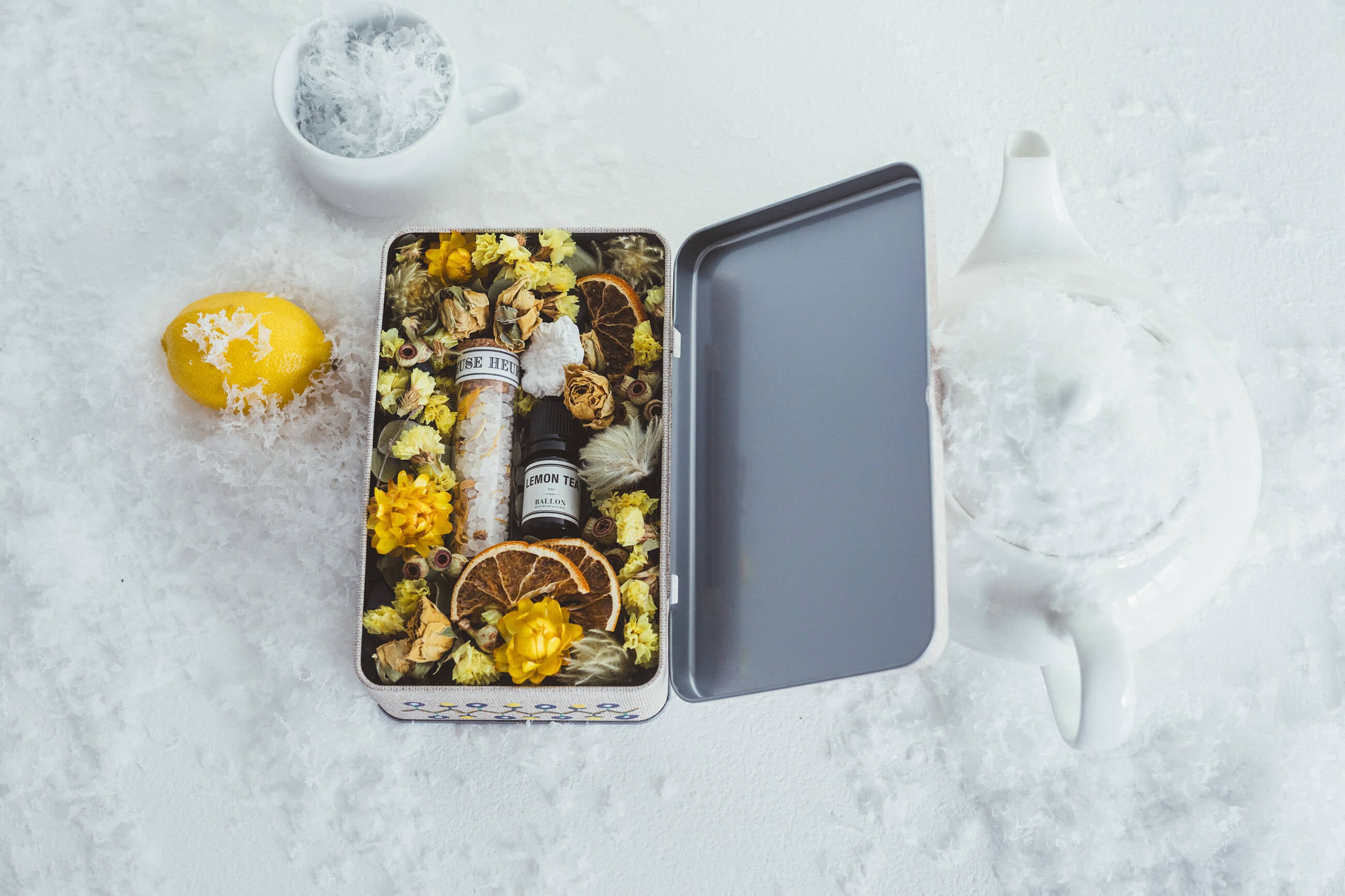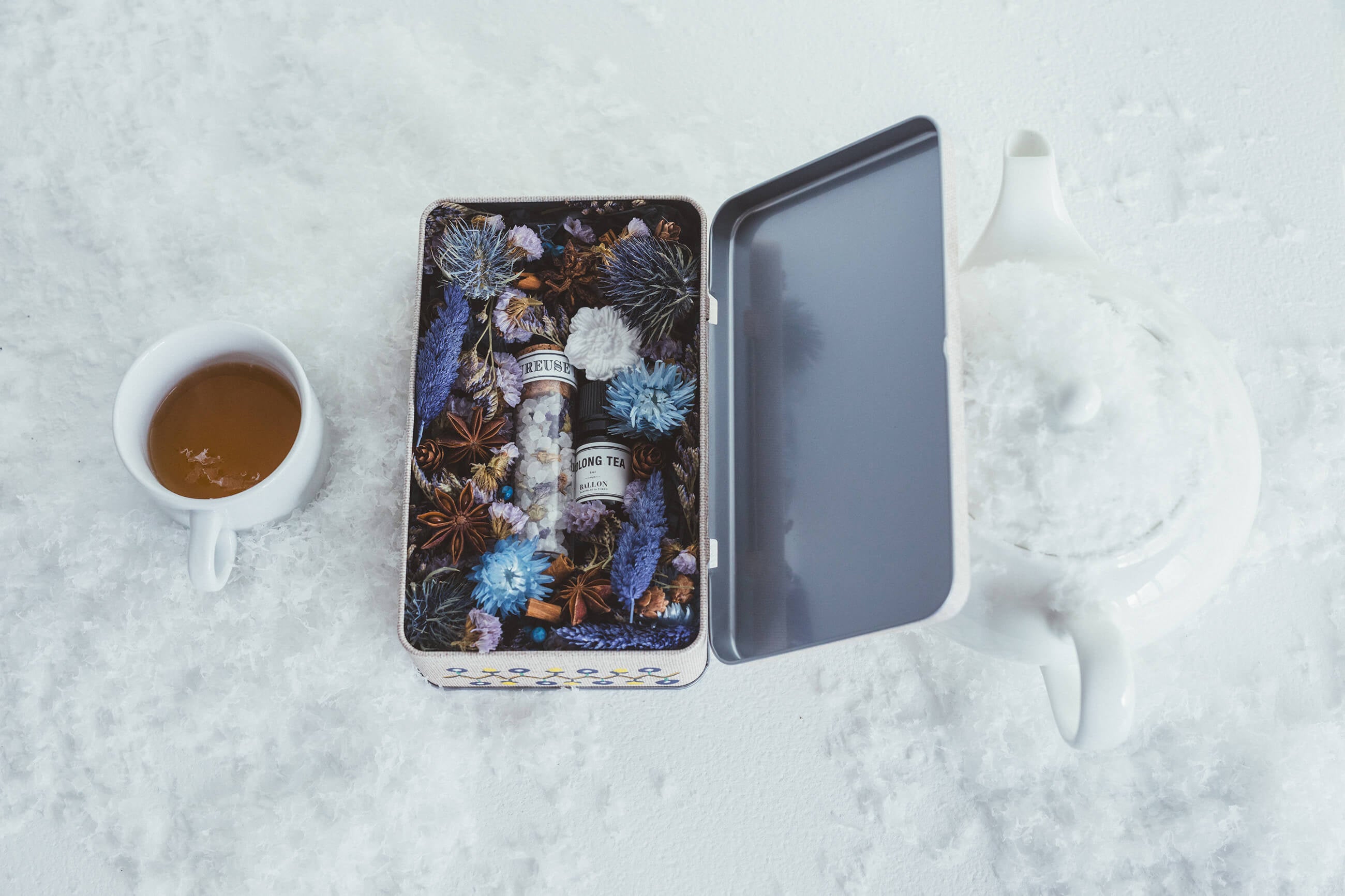 アロマブランドの「BALLON(バロン)」さんに、「お茶を飲みながら編みものを楽しむ」シーンをイメージ して、Miknitsオリジナルのアロマオイルとバスソルト「レモンティー」「ウーロン茶」をつくっていただきました。