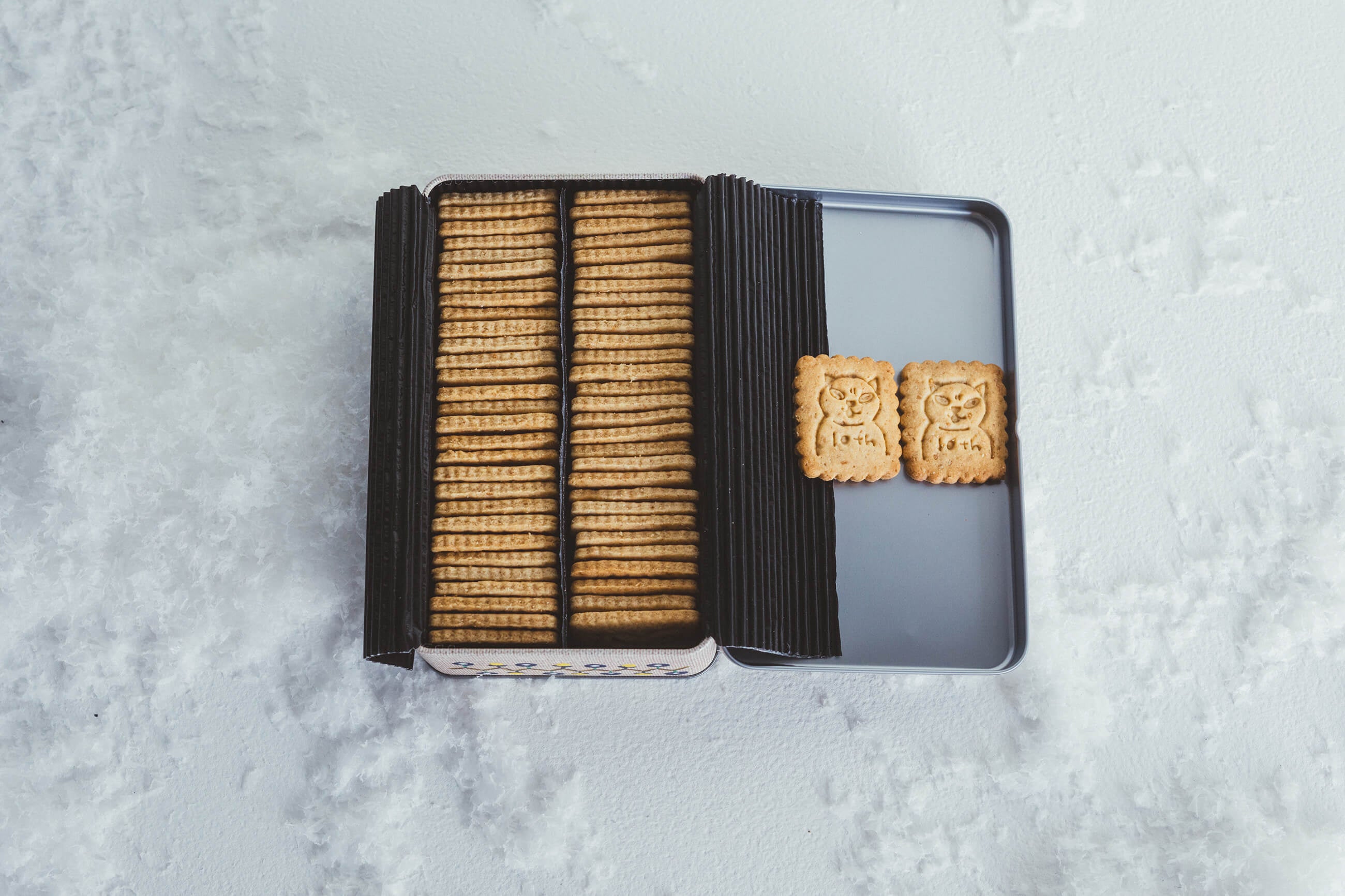 三國万里子さんの妹のなかしましほさんがが店主をつとめるfoodmoodによる特別なクッキー缶は、姉妹の故郷・新潟の「佐渡バター」を使った贅沢なサブレがぎっしり。三國さんの手描き「黒猫」の型押しがされている10周年特別版です。