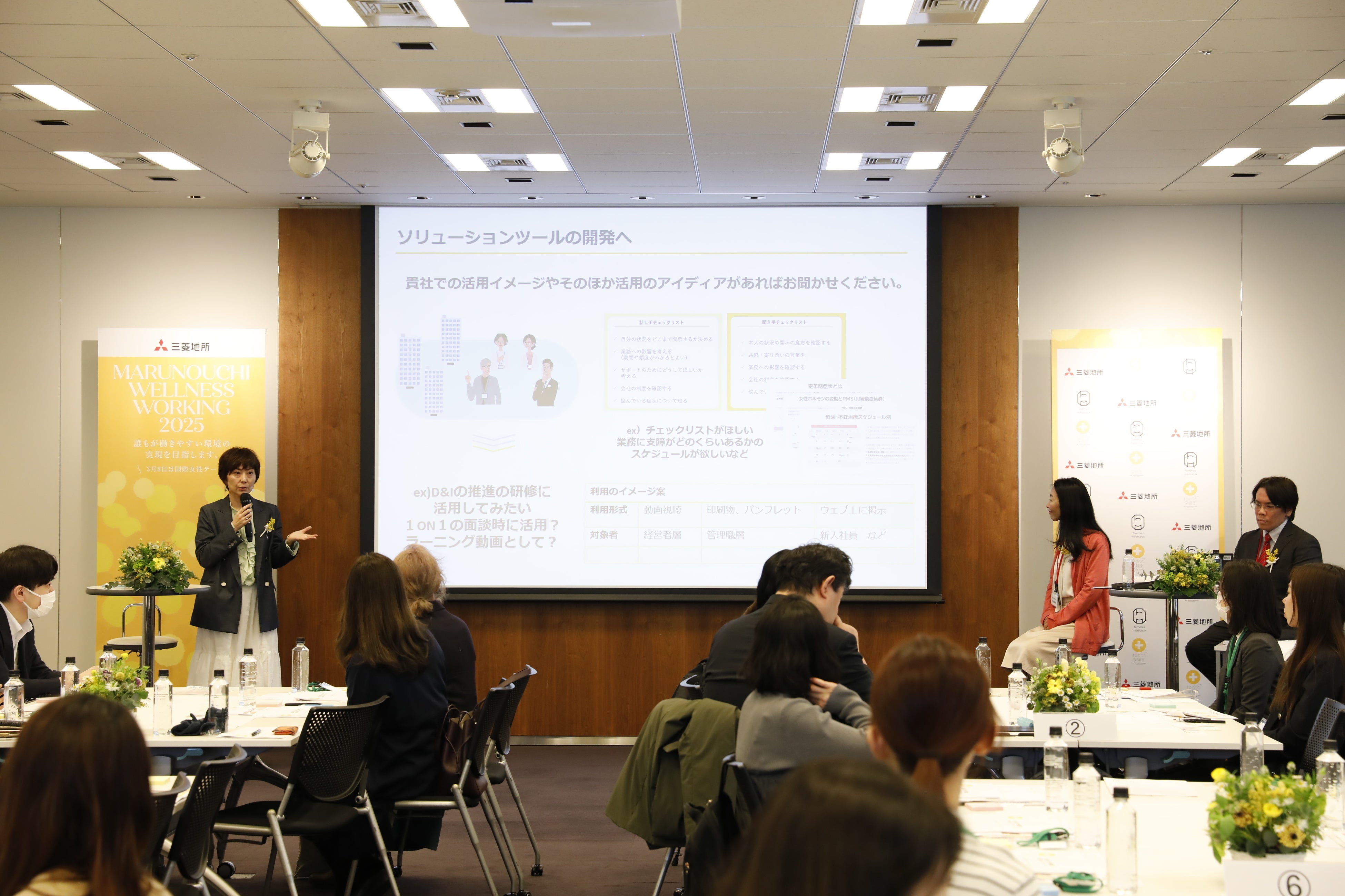 今回は、職場での従業員の健康課題をどのようにサポート・解決していくべきかにフォーカスをあて、「まるのうち保健室 産学医ウェルネスワーキング」を開催いたしました。働く女性を取り巻く健康課題を起点としつつ、誰しも起こりうる不調時でも活用できる、円滑な業務推進に必要なヘルスコミュニケーション術や、健康に関する知識の共有等を、神奈川県⽴保健福祉⼤学の吉田 穂波先生らにレクチャーいただきました。また、今後の活動や課題解決へ生かしていただくための参加企業同士のワークショップも展開しました。