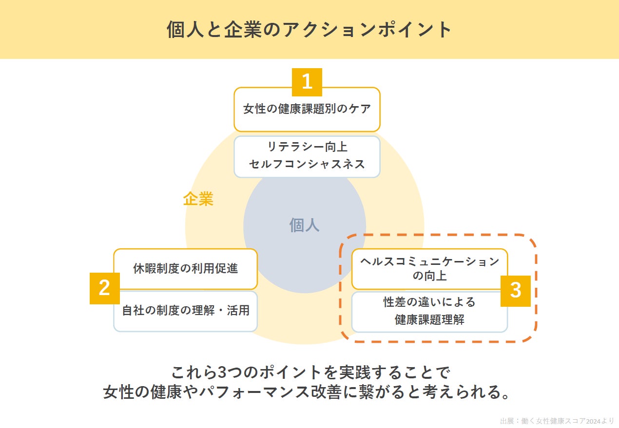 昨年度(2024年3月発表)の働く女性 健康スコアから見えた課題に対し、参画企業とともに、女性の健康課題の解決やパフォーマンス改善にむけた企業のアクションポイントを3つ導き出しました。