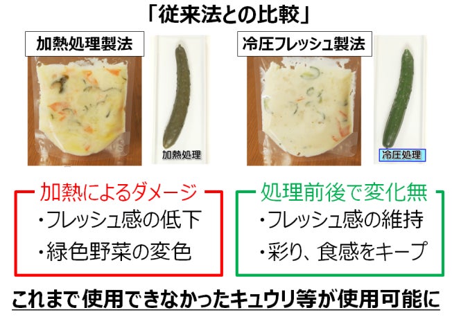 食品を低温・高圧処理することで、より素材本来の食感や色味を残し、味わいを維持しながら日持ちを延長できる当社独自の技術です。