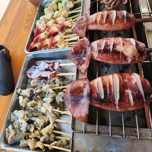 食材は、常磐ものを含むイカやヤナギガレイ、メヒカリの一夜干し他、福島牛串も味わえて大満足のセット内容を提供しております。2日間だけの特別なバーベキュー体験をこの機会にご堪能いただけます。(予約優先)