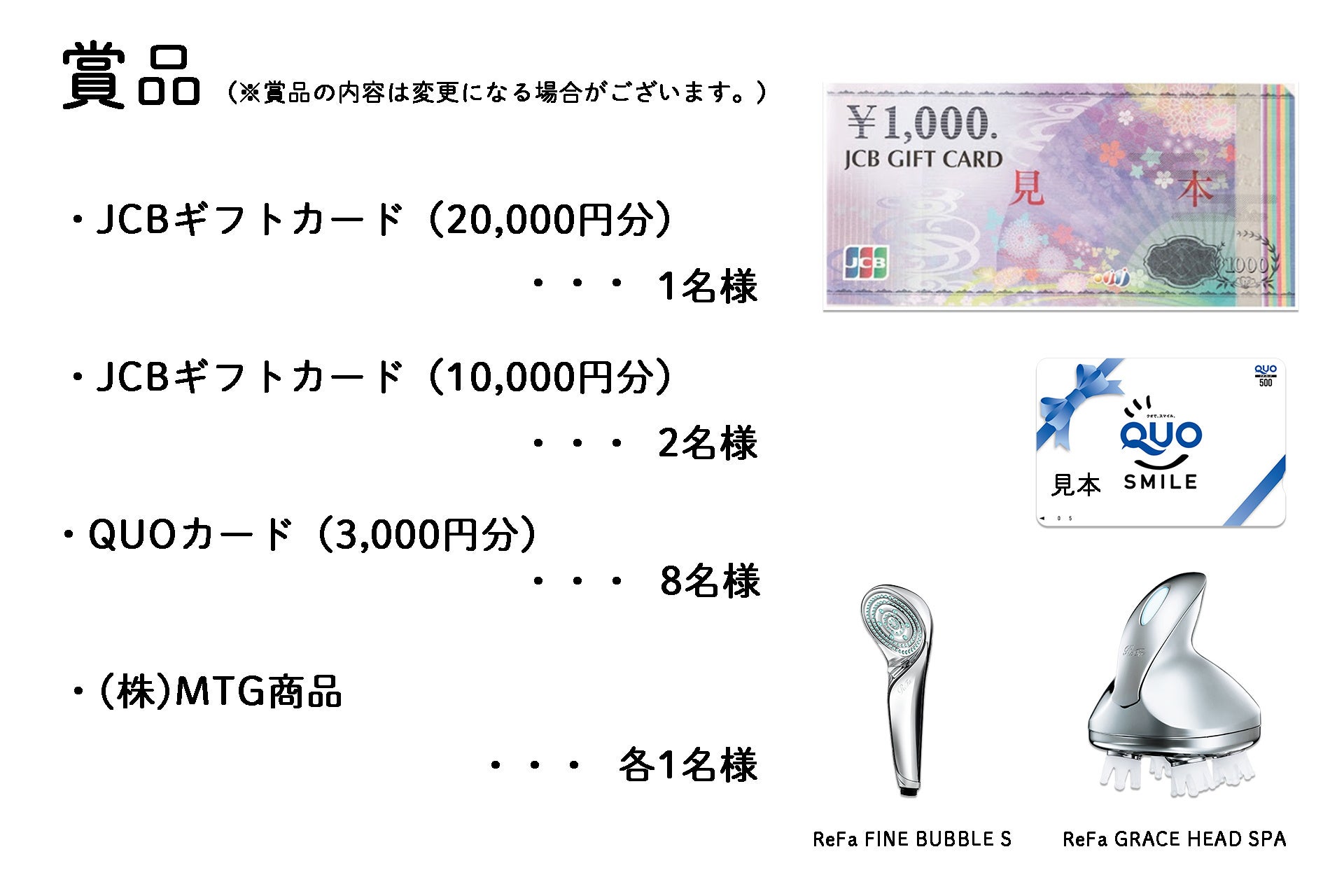 | 賞品 | 金券 JCBギフトカード 20,000円分 :1名様 JCBギフトカード 10,000円分 :2名様 QUOカード 3,000円分 : 8名様 (株)MTG商品 ReFa FINE BUBBLE S(シャワーヘッド) : 1名様 ReFa GRACE HEAD SPA(ヘッドスパ機器) : 1名様 |