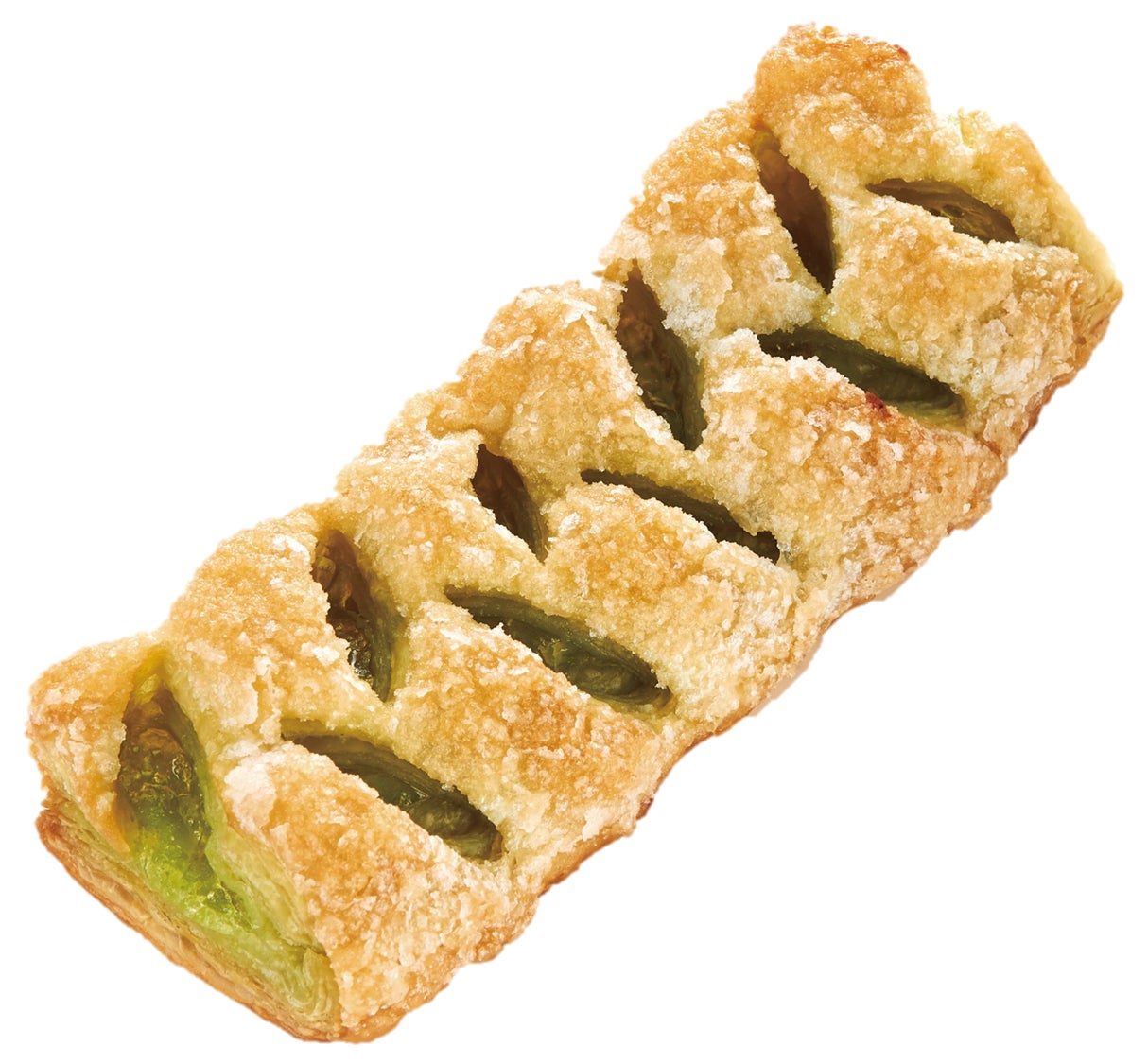 ブドウの女王と呼ばれている「マスカットオブアレキサンドリア」を使用。上品な香りとさっぱりとした甘みが魅力のマスカット入りジュレをさわやかな緑色のサクサクのパイ生地で包みました。