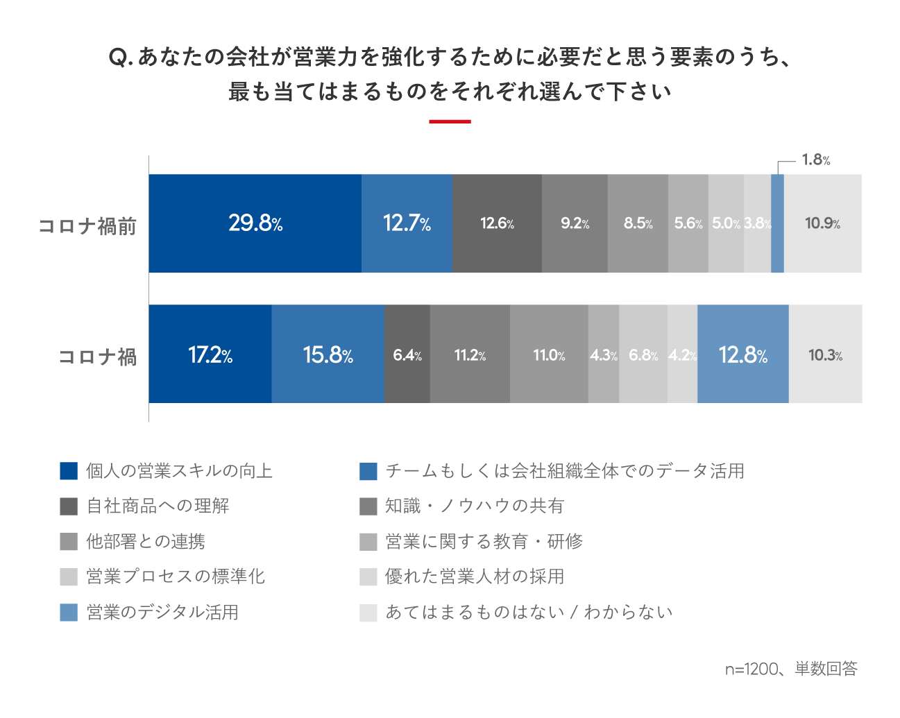 一方で「営業のデジタル活用」は1.8%から12.8%(7倍以上)、「チームもしくは組織全体でのデータ活用」は12.7%から15.8%(1.2倍以上)に増加し、コロナ禍前よりも重視される傾向にあることから、今営業に求められていることが個人の力ではなく組織の力に変化しつつあることが浮き彫りになりました。