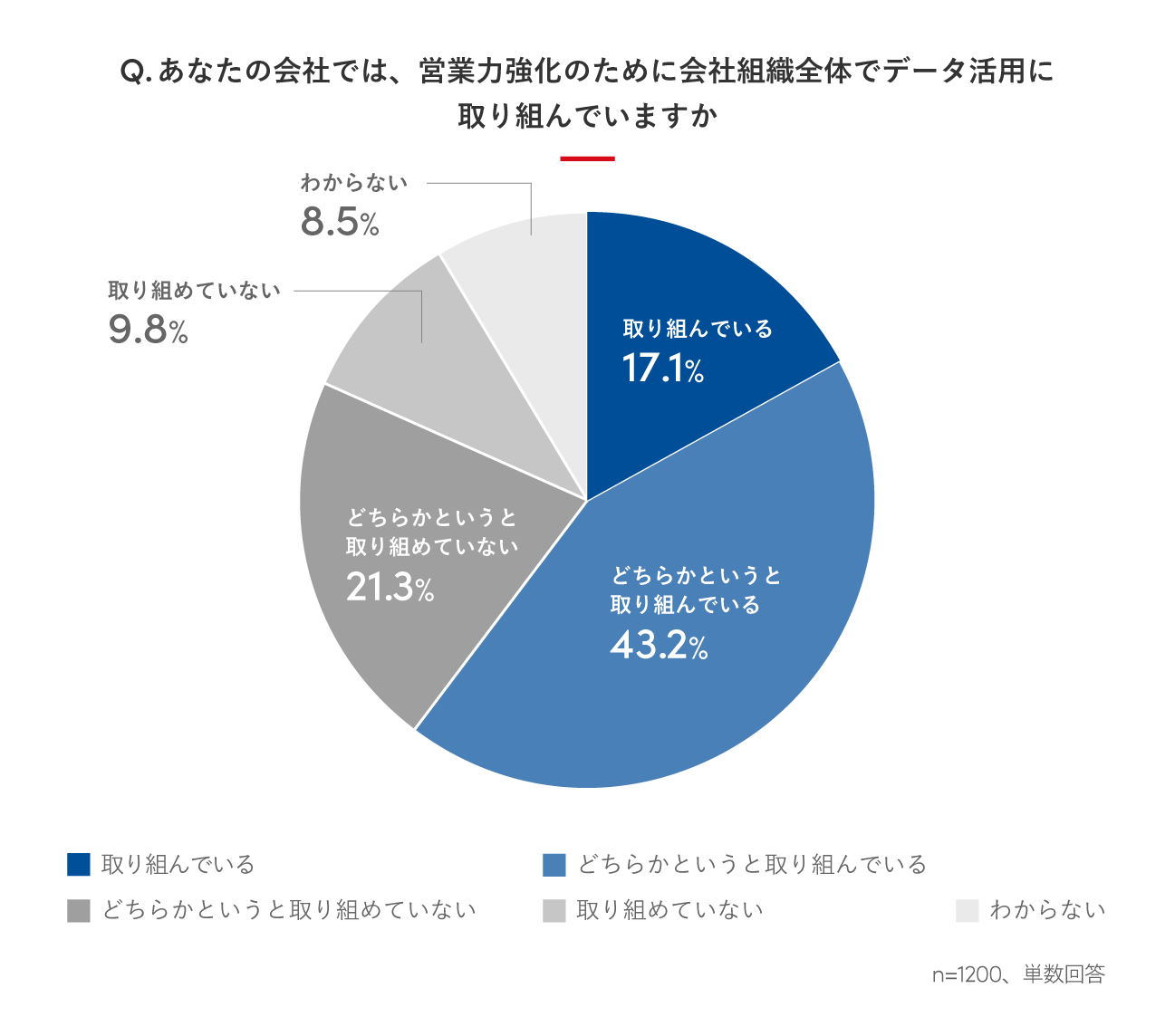 所属する会社において、営業力強化のために会社組織全体でデータ活用に取り組んでいるかを聞いたところ、約2割は「取り組んでいる(17.1%)」と回答し、「どちらかというと取り組んでいる(43.2%)」と回答した人を合せると6割(60.3%)を超え、組織でのデータ活用への取り組みが進んでいることがうかがえます。