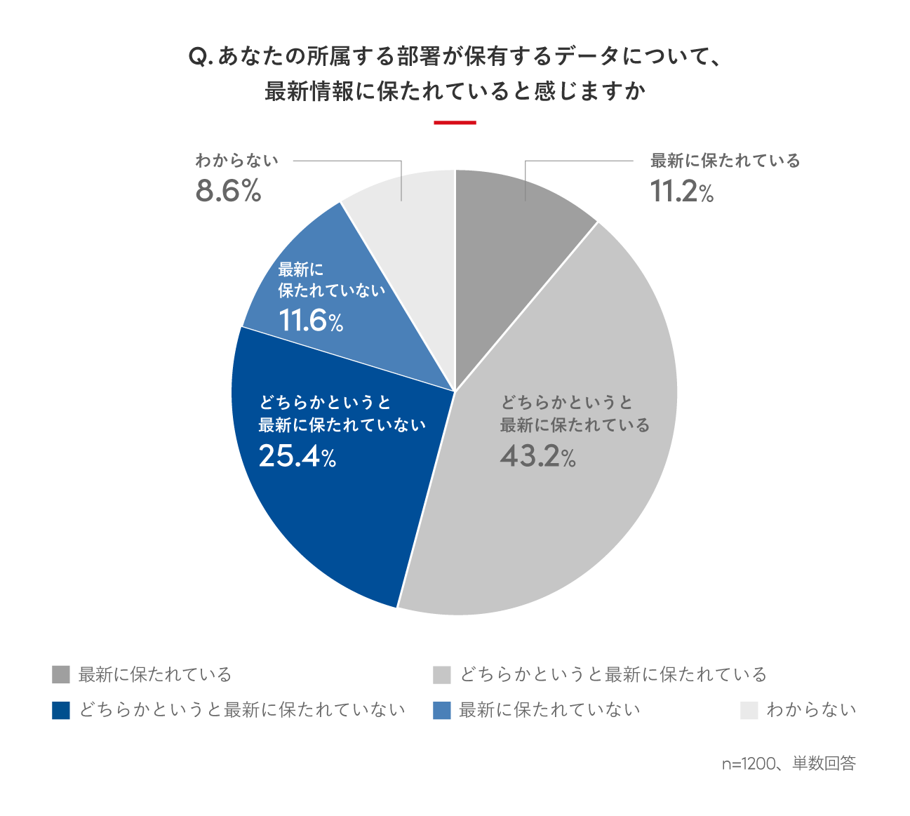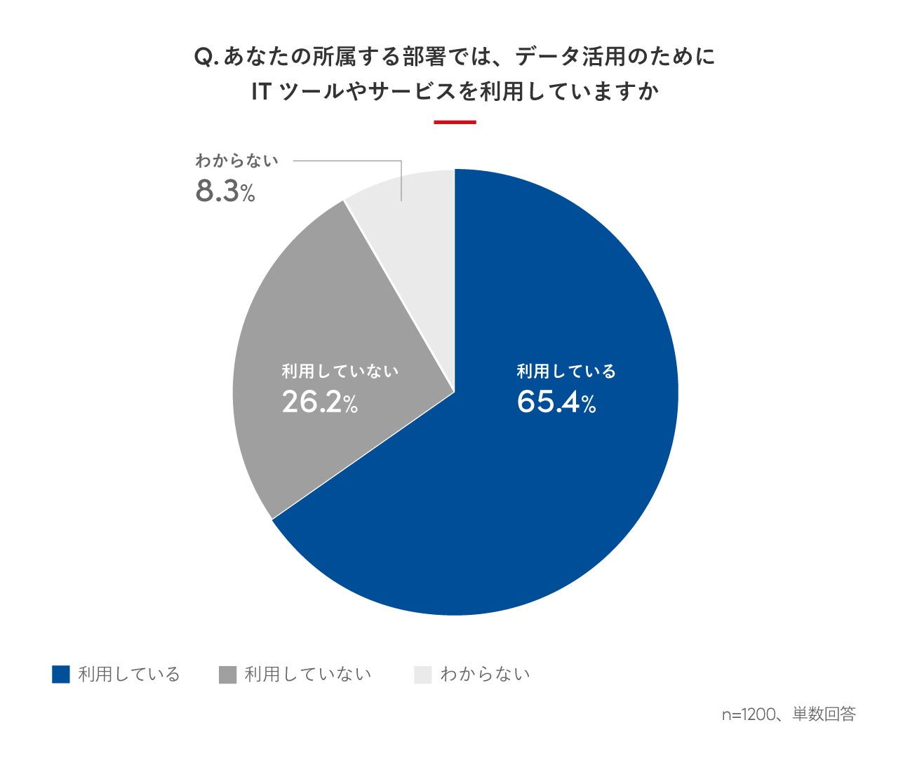 所属する部署で、データ活用のためにITツールやサービスを利用している人は、6割超の65.4%に上りました。また、所属する部署が保有するデータについて、最新情報に保たれているかを聞いたところ、「どちらかというと最新に保たれていない(25.4%)」と「最新に保たれていない(11.6%)」の合計が37.0%と4割近くに上る結果となりました。データ活用を推進しながらも、情報更新に課題を抱えている様子が見受けられます。
