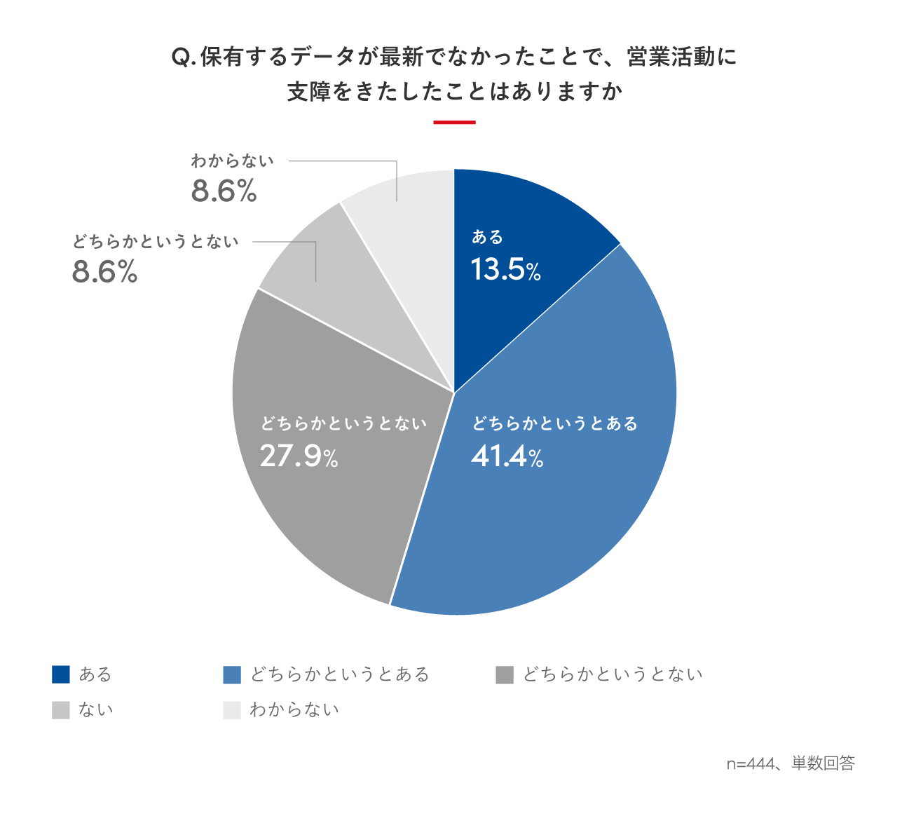 また、保有するデータが最新でなかったことで、営業活動に支障をきたしたことがあるかの問いに対し、「ある(13.5%)」と「どちらかというとある(41.4%)」の合計が54.9%と過半数に上りました。データベース上の顧客に関する情報の更新性を担保することは、営業活動においてデータを活用する上で重要であることが分かります。