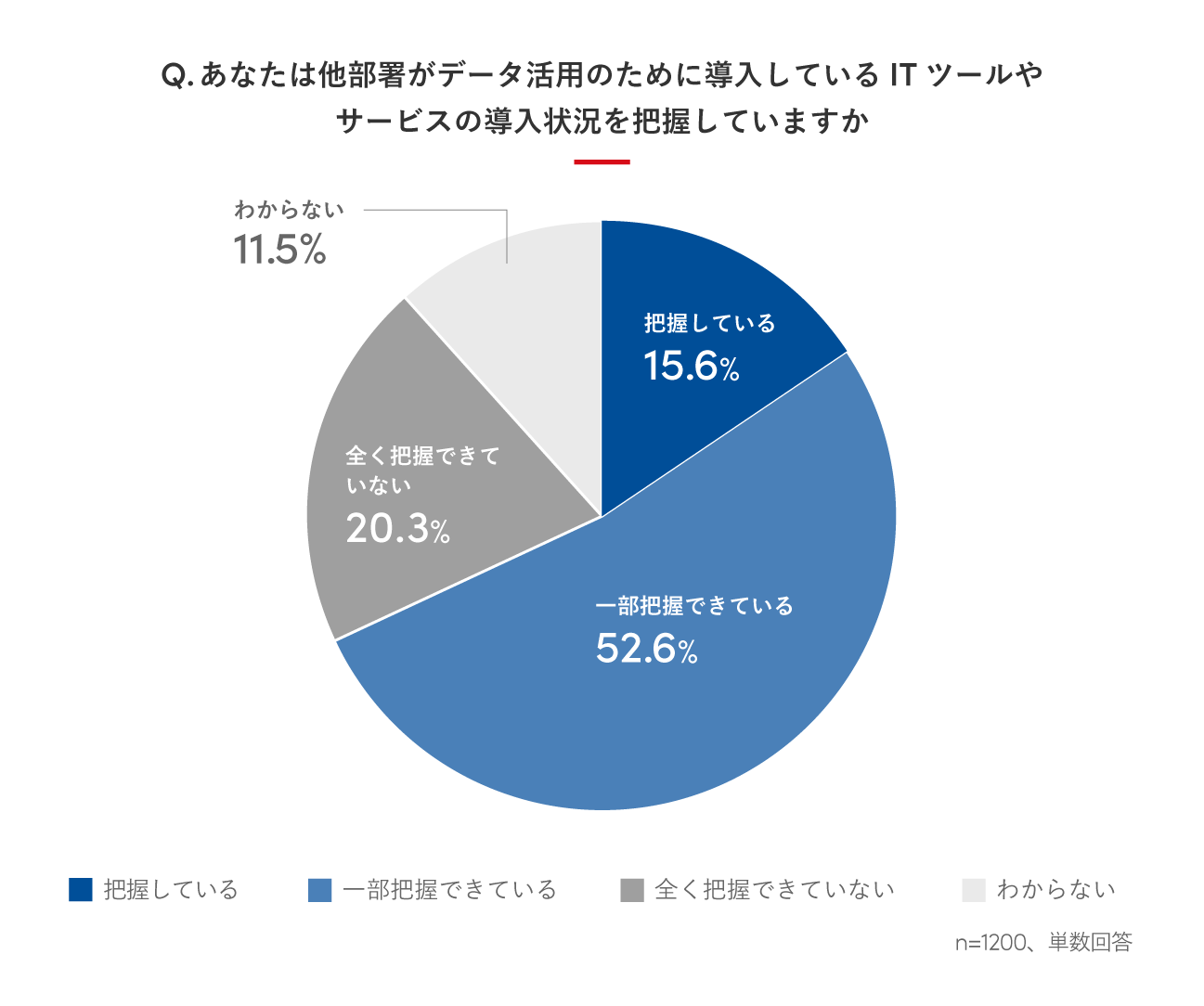 他部署がデータ活用のために導入しているITツールやサービスの導入状況を把握しているかを聞いたところ、「一部把握できている」と答えた人が52.6%と最も多く、「把握している」と答えたのは15.6%と全体の2割未満という結果になりました。