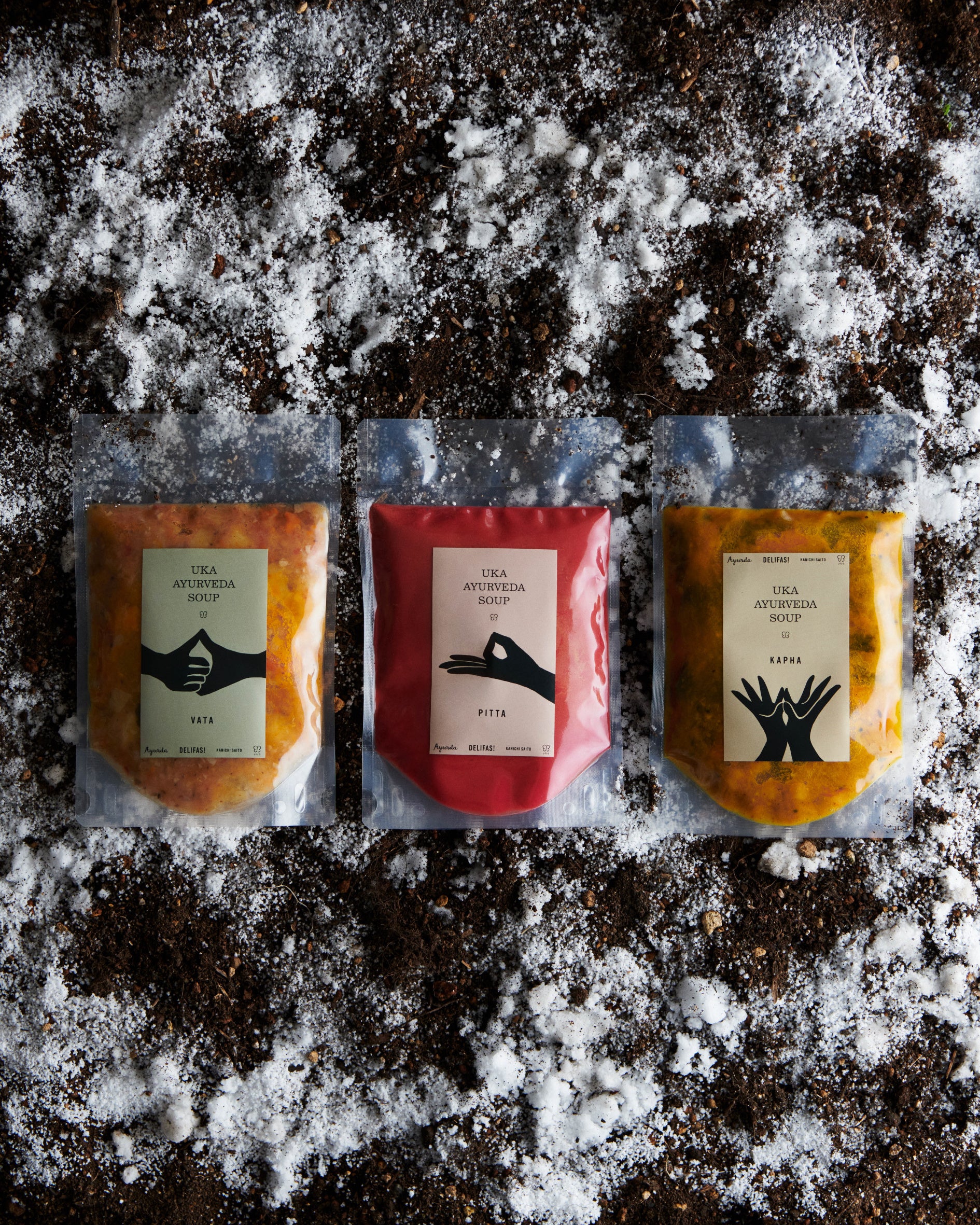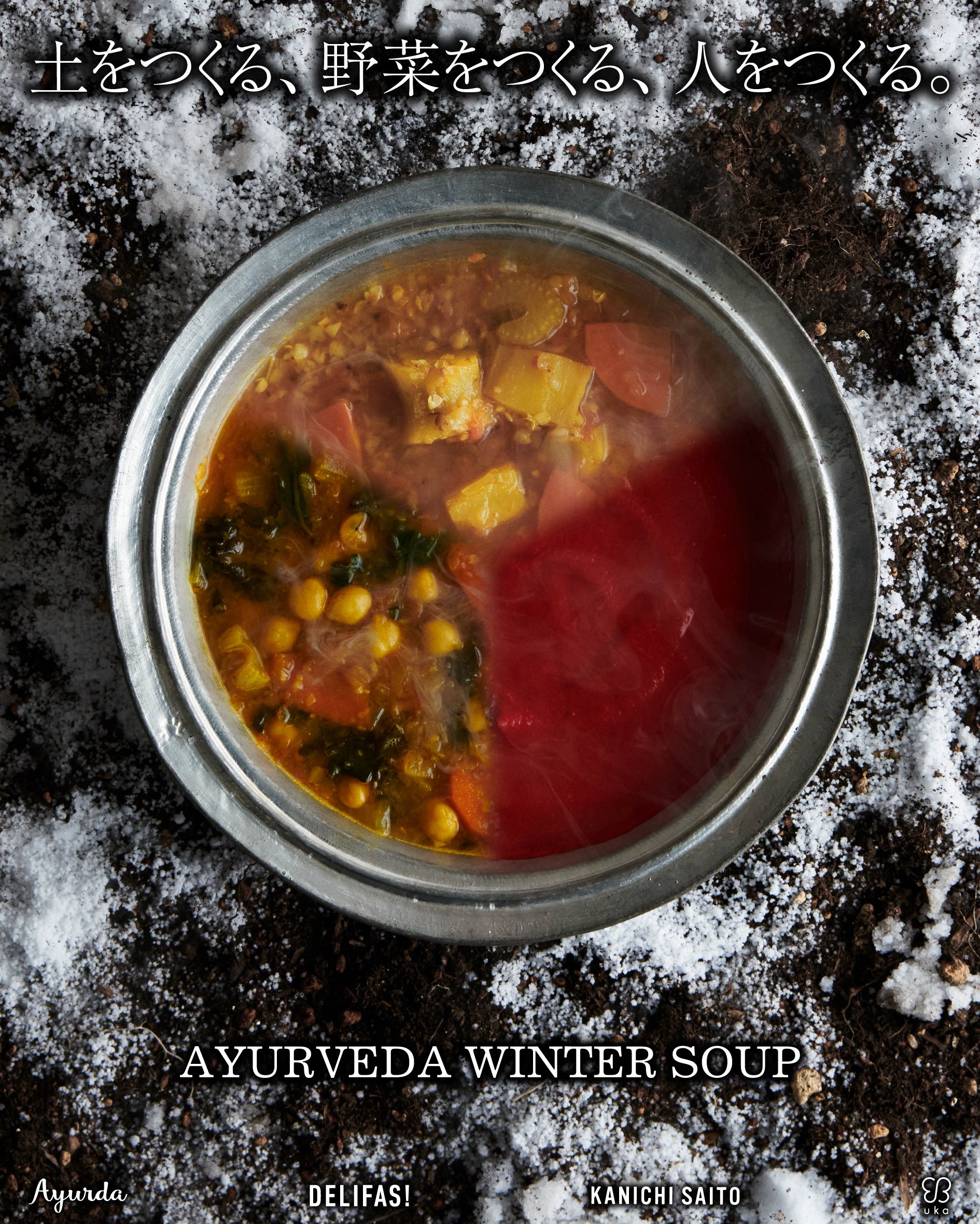 アーユルヴェーダの理論に基づきドーシャ(体質)に応じた3種類のスープを、 Ayurda 、DELIFAS!(デリファス)、ukaの3社で共同制作し、2023年8月に発売したSUMMER SOUP。その第2弾となる今回は、乾燥の季節にカファ(脂質)をしっかり作り、滋養のある冬野菜を使用した栄養を逃さず丸ごと食べられるスープです。