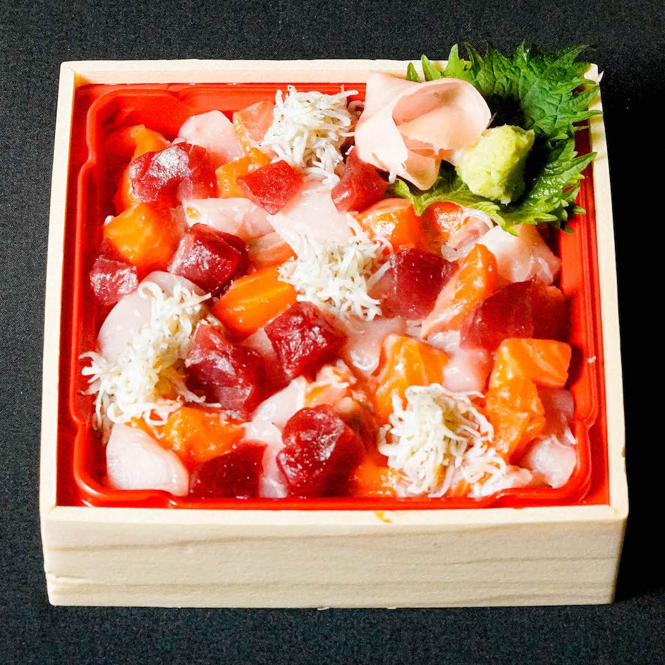 静岡・沼津直送の白身魚、マグロ、サーモンを散りばめた当店定番の海鮮丼。それぞれの魚が食べやすいブツ切りになっているためほどよいバランスで口に運べ、また、同時に新鮮な魚本来の食感と味わいをよりしっかりと感じていただけます。