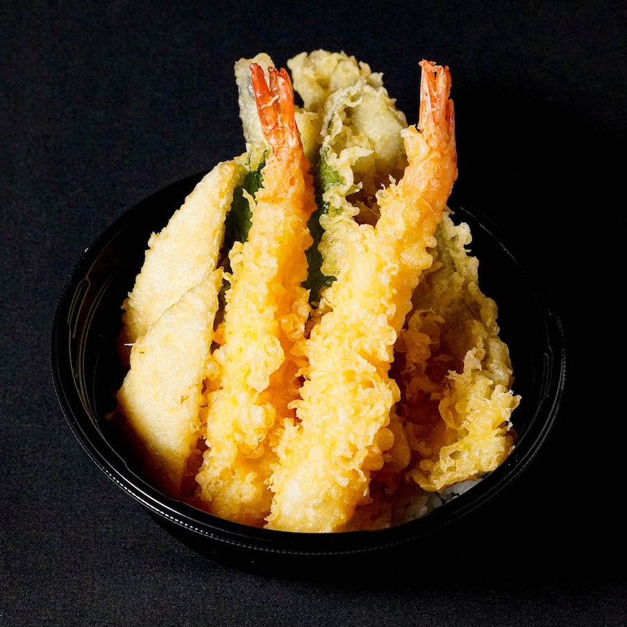 “三つの福をもたらす”をコンセプトに、エビ、タケノコ、タチウオの天ぷらがそびえ立つ三福天丼。当社の水産拠点である静岡・沼津から直送した地のタチウオに、タケノコや大葉といった旬の食材を添え、満足度の高い豪華な一品です。