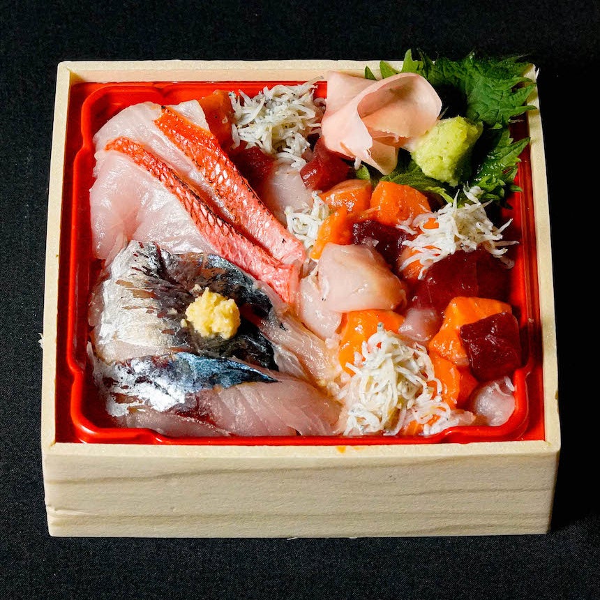 静岡・沼津直送の白身魚、マグロ、サーモンのブツ切りに加えて、厚めに切って皮目に炙りを施した自社船団の金目鯛とアジをトッピング。さまざまな鮮魚の味わいのコントラストを楽しめる、ちょっと贅沢に仕立てた海鮮丼です。