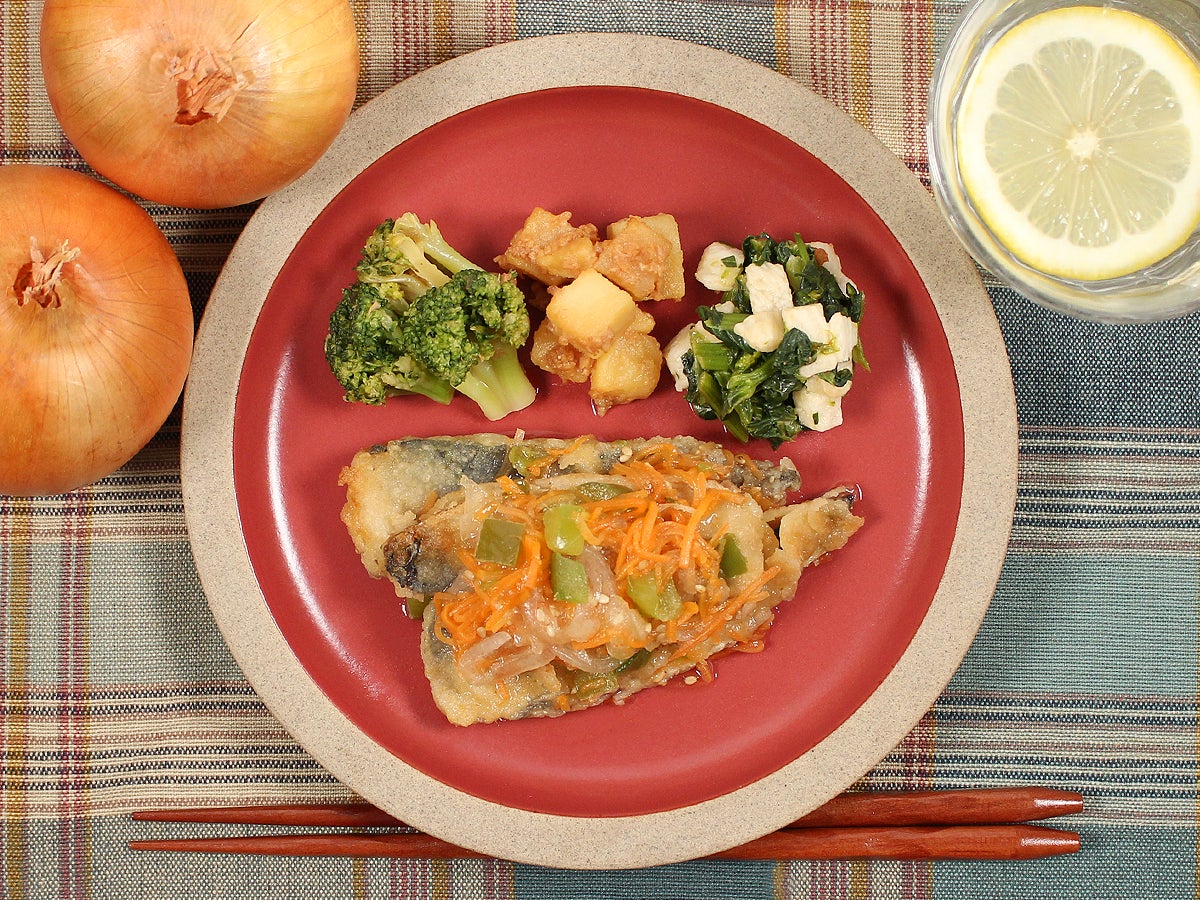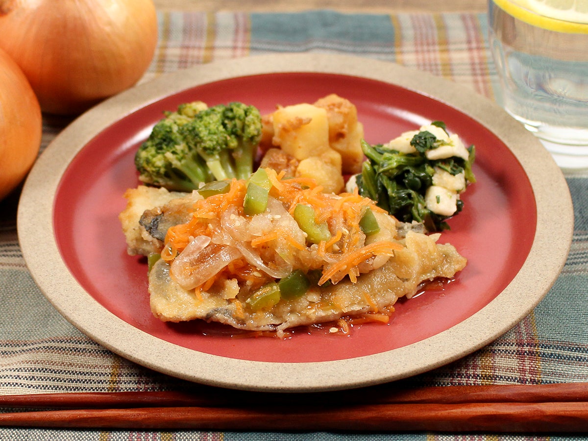 ふっくら揚げた九州産いわしの竜田揚げに、かつおと昆布の合わせだしを使用し、まろやかに仕上げた南蛮酢をかけました。付け合わせの野菜は玉ねぎ、人参、ピーマンを使用しております。