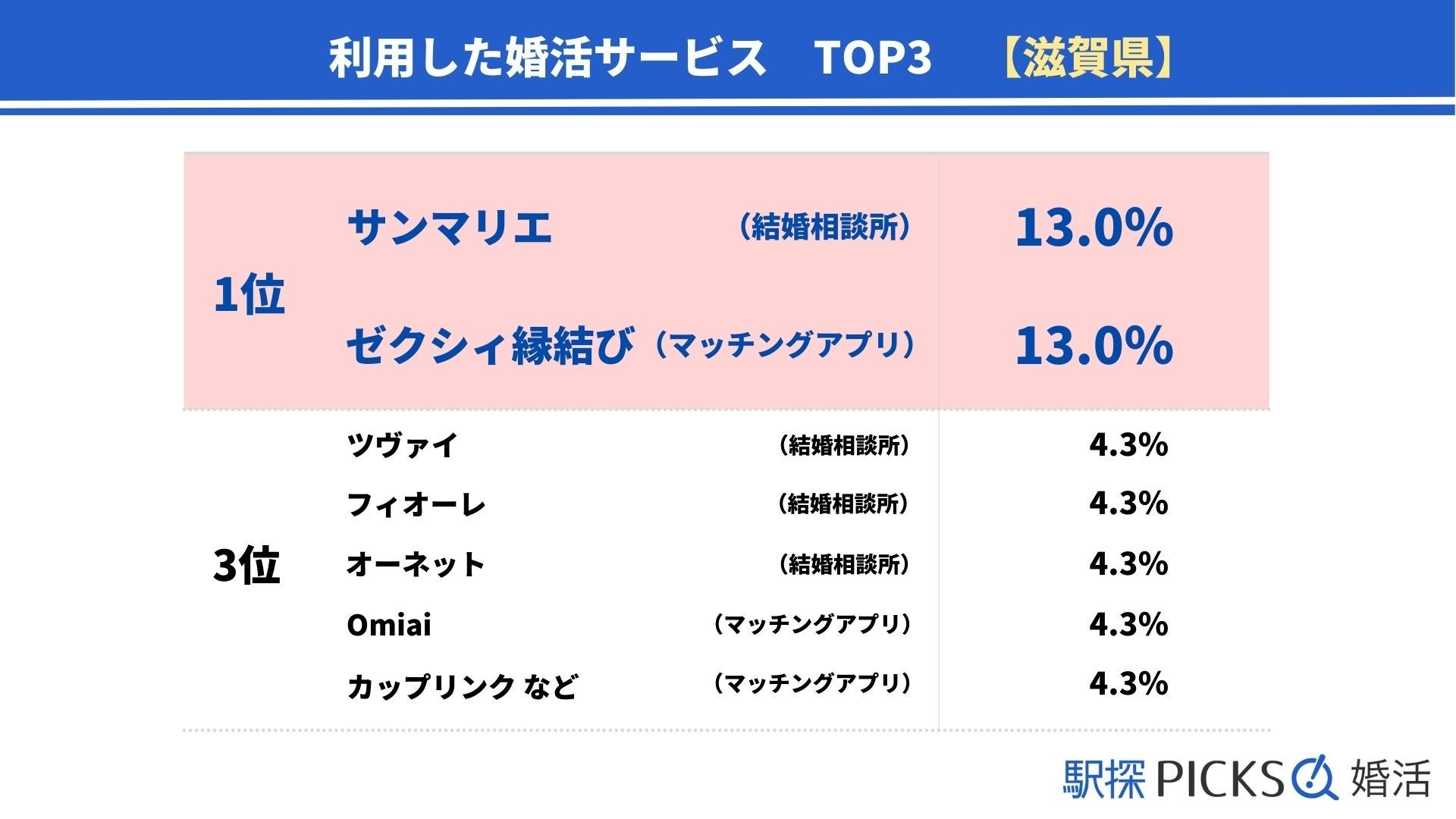 滋賀の人を対象に利用した婚活サービスを聞いたところ、結婚相談所の「サンマリエ」とマッチングアプリの「ゼクシィ縁結び」が13.0%の同率で1位となりました。