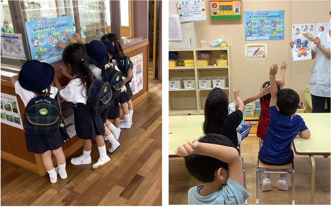 2024年6月に配布した熱中症対策ポスターは、教室や階段など、園児が見やすい場所・高さに掲出されました。「キャラクターと平仮名なので、園児が興味を持って見ている」という先生の意見も。なかには、保育活動の一環で教材として活用し、「ポンちゃんがお出かけに行くみたいだよ。ポンちゃんを熱中症にさせないために、どんな持ち物が良いかな?」とクイズ形式で熱中症対策の話をした園もありました。玄関に貼った園では保護者も興味を持ち、「登降園の際の会話の話題にもなっている」との声も上がりました。すでに「ポンちゃん防災おやくそくポスター」を掲示した園からも、同様の声をいただいています。