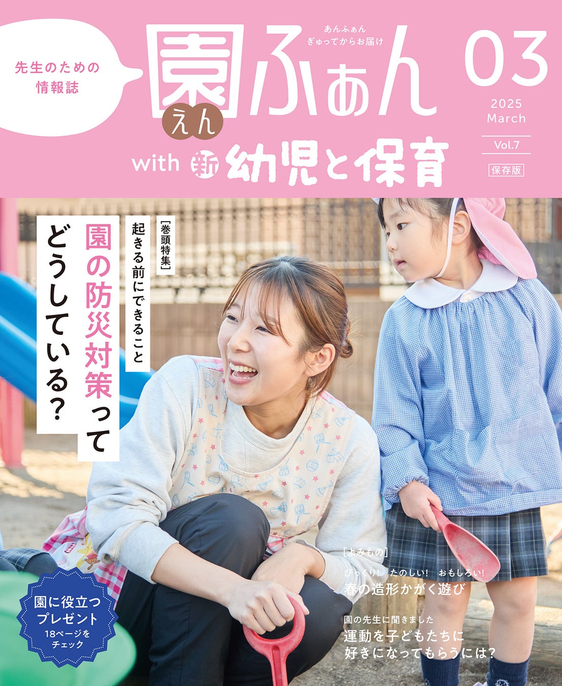 「園ふぁん with 新 幼児と保育」3月号では、「起きる前にできること 園の防災対策ってどうしている?」というテーマで、園の防災について特集。保育防災コンサルタント®︎の藤實智子先生による園の防災の心得、幼稚園の防災対策の実例や各園の先生おすすめの防災絵本・紙芝居の紹介など、充実の内容です。