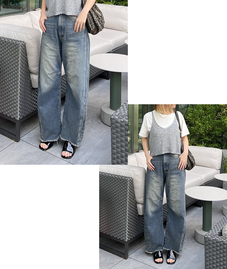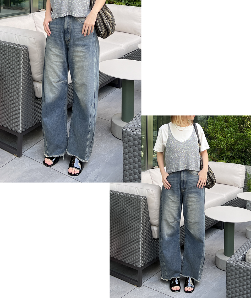 [低身長/高身長/大きいサイズ有]裾フリンジカーブデニムパンツ