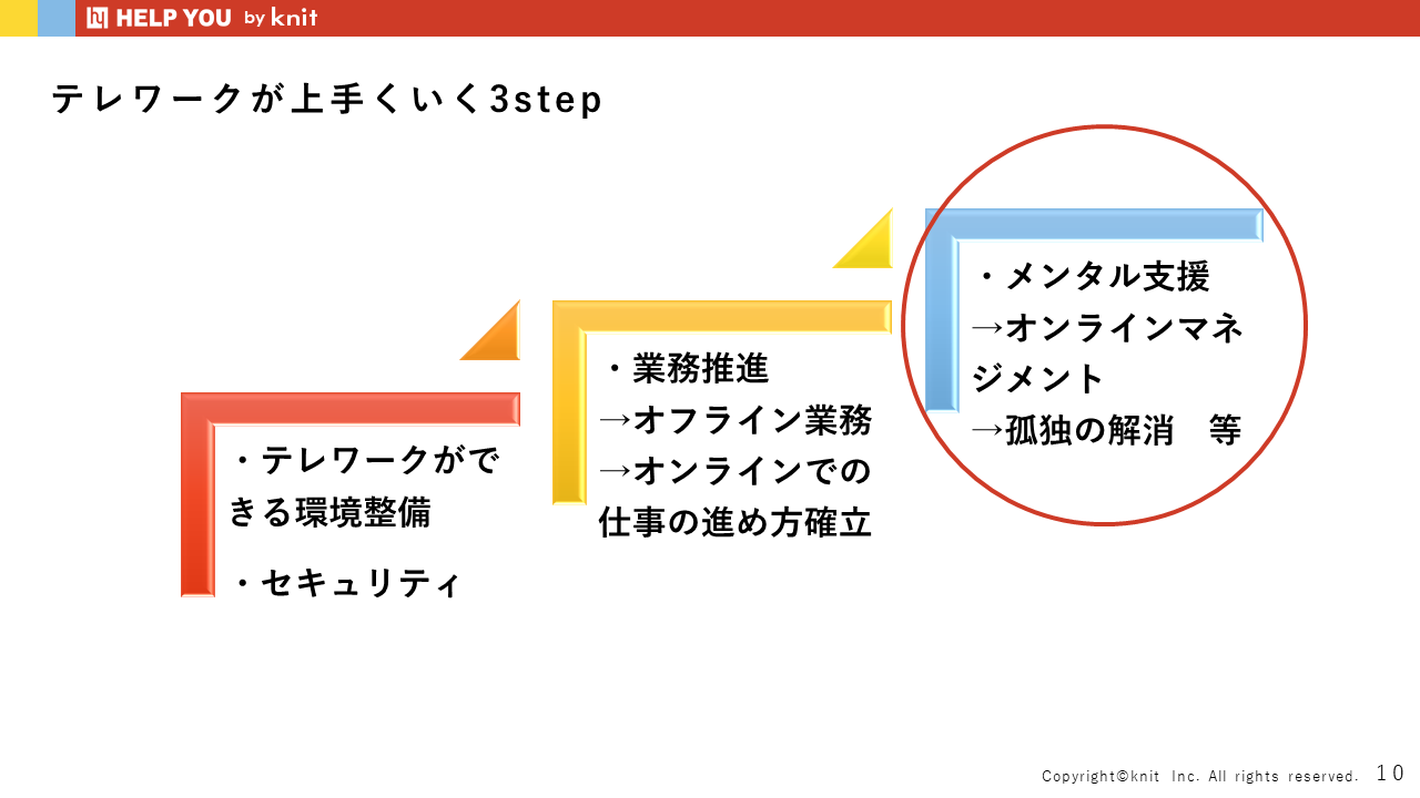 テレワークを円滑に進めるためには3つのステップがあります。1つ目はテレワークがてきる環境が整っていること、2つ目はオンラインで業務を円滑に進める体制が整っているか確認する必要があります。最後の3つ目では、オンラインで業務を行うからこそ、孤独感を解消することが必要だと伝え、ニットが行っている取り組みについてお伝えしました。