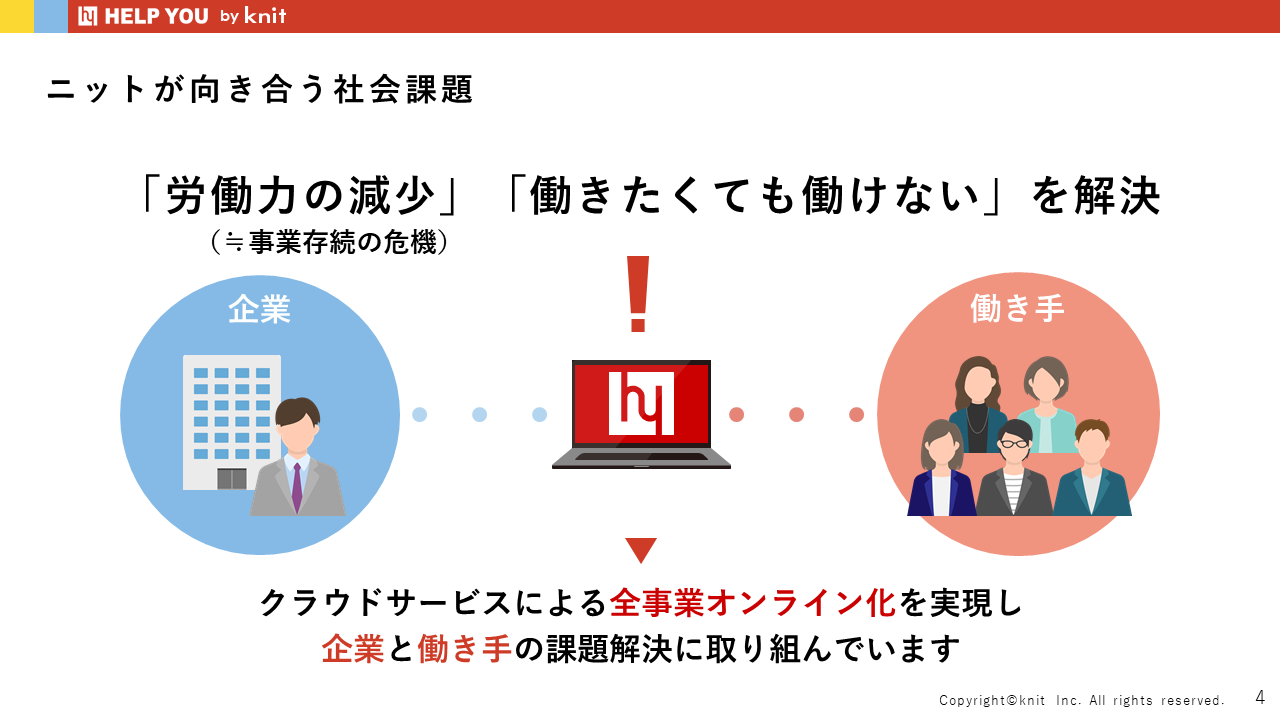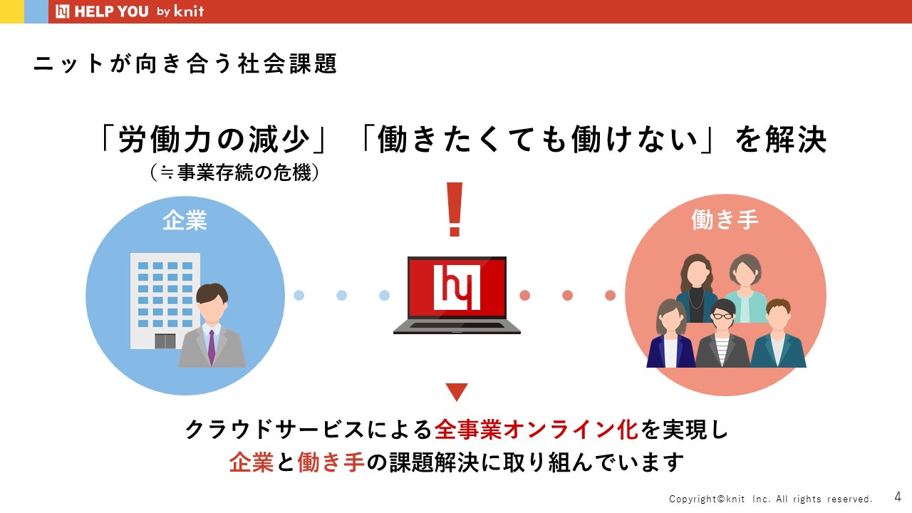 現在、企業側は労働力が減少している傾向にあります。人手不足ということは、事業が存続していく上で危機になりうる状況です。反対に働き手側からしても、さまざまな事情で働きたくても働けないといった問題があります。企業と働き手、双方の問題を解決をするため、ニットはクラウドサービスによる、全事業をオンライン化を実現しています。