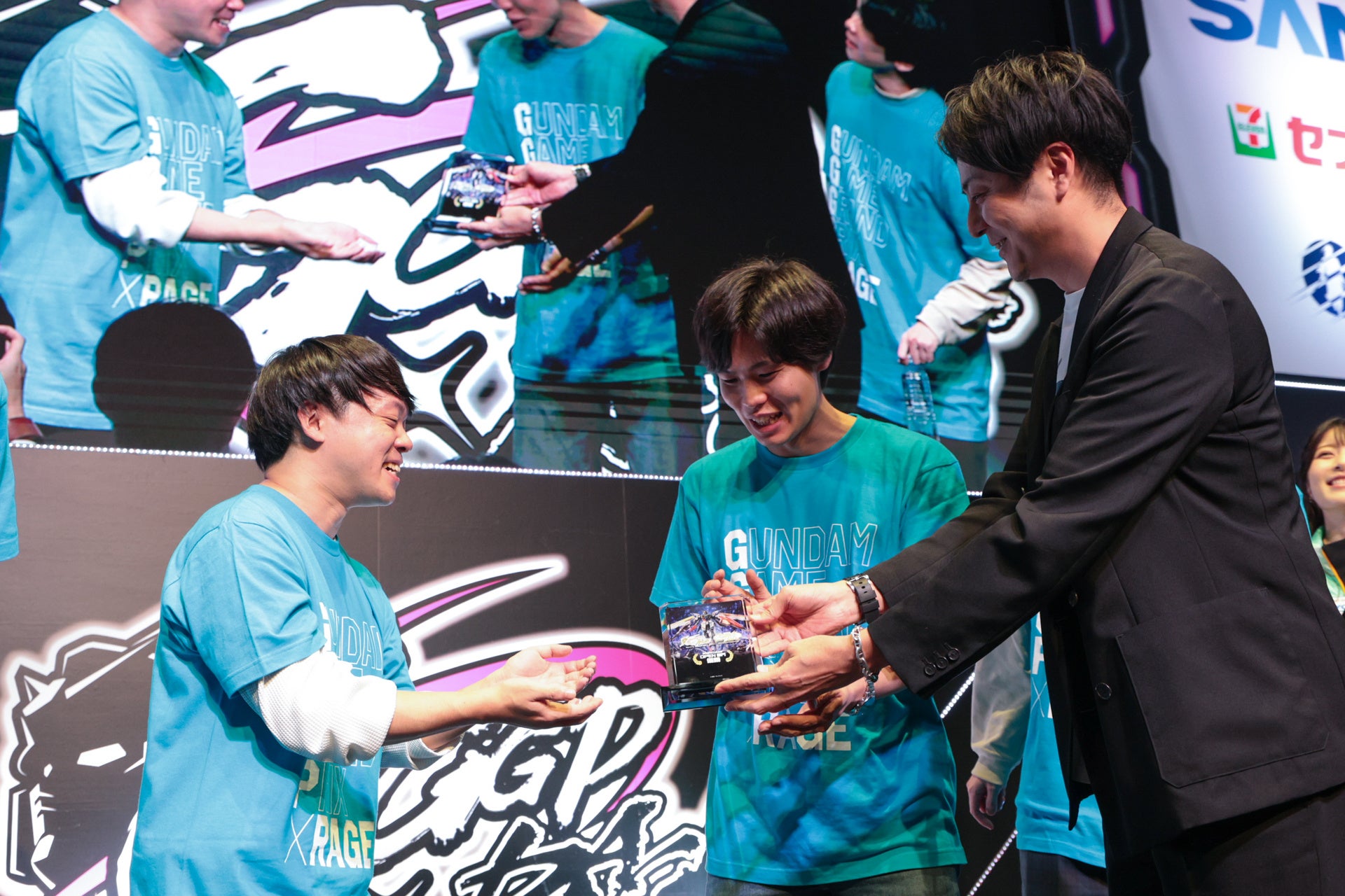 優勝セレモニーでは、【 ZETA DIVISION 】に「GGGP×RAGE オリジナルカラーリングガンプラトロフィー」が授与されました。チャンピオンとなった【ZETA DIVISION】けんき選手は「途中興奮しすぎて、何をしているかわからなくなった。何のボタンを押していいのかわからなくなったときに激戦を繰り広げてきた他のチームが一緒に戦ってくれたから勝てた。ありがとう」と語り、鈴木ノリアキ選手は「やりこみが結果に繋がるゲームだということが証明できたと思います。世界最強のスコア8がコーチに来てくれたことがとても運が良かった。教えてもらえたことがちゃんと本番で出来たことが勝利に繋がったと思います。」とインタビューに答えました。また解説のなかおさんは「今回予選から携わって、プレイヤーと一緒にいる時間がとても長かったです。イニブ自体の稼働がまだ3か月半とは思えない練習成果を出したOPEN部門、初めて筐体を触るストリーマーの方がどのくらい動けるのかをコーチと試行錯誤したINVITATION部門。わくわくしながら楽しく過ごすことが出来ました。」とストリーマー同士の熱い戦いを振り返り、イベントは幕を下ろしました。