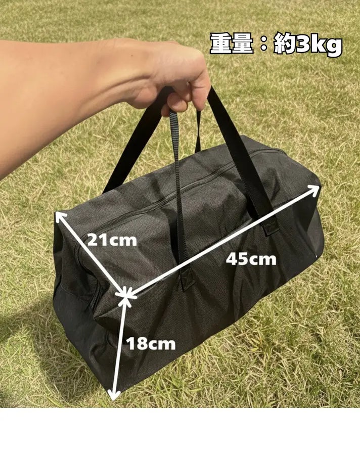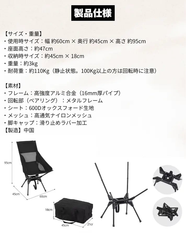 AXIS 360は独自の折りたたみ機構により、使用時は幅60cm×奥行き45cm×高さ95cmのハイバック仕様ながら、収納時は45cm×21cm×18cmとコンパクトにまとまります。重量約3kgと大型のアウトドアチェアの中では軽量で、車載スペースを圧迫せずに持ち運びも楽々です。