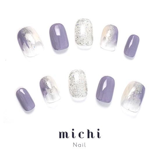 クリア感を楽しめる塗りかけネイル。くすみパープルとホワイト、シルバーラメで清涼感のある夏向け上品ネイルです。落ち着いた印象で、大人っぽく浴衣と合わせたり、オフィスで使ったりと様々な場面でお使いいただけます。